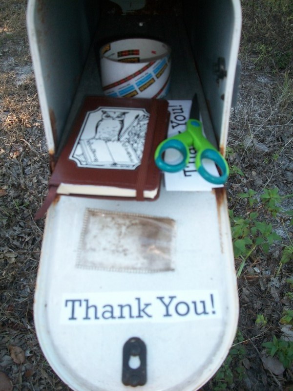First stop: the mail box, where I placed it on the inside of the mail box door. An added bonus: Whoever picked up the mail would be thanked as well!