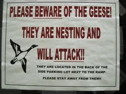 One of the ESL classes I teach is "Foundations," which is the beginning level. Because students at that level have virtually no fluency, one of the most effective teaching methods is to show them objects or flash cards to build vocabulary. Before the first morning class, I noticed three Canadian Geese milling around outside the door. I thought it would be a great lesson to write "goose," pronounce the word and then open the door so the students could see the real thing. Every thing went smoothly until I opened the door when one waddled in. To make matters worse, it was a little aggressive and it took several lunges with my book cart to get the trespassing fowl to leave. On the upside, not one of those students will ever forget the definition of goose.