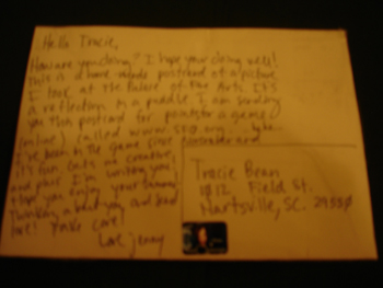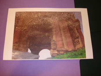 I took this picture while visiting the Palce of Fine Arts. However, this is no ordinary picture. This is a picture of the Palace of Fine arts reflection in a puddle! I printed this out at work on regular paper. Cut a purple cardboard file folder to give my postcard the more cardboardy hard feel. Wrote and addressed the postcard to my friend in SC and wrapped the postcard in packaging tape. (added note. i was really hoping i could mail this to someone in SF0 however i could not figure out how to get access to people's address. guess its a privavcy thing. i thought i have seen other people doing tasks and sending things through the mail to each other...hmmm?)