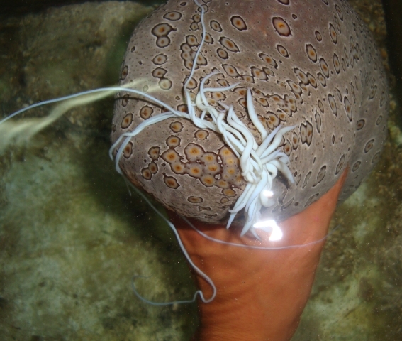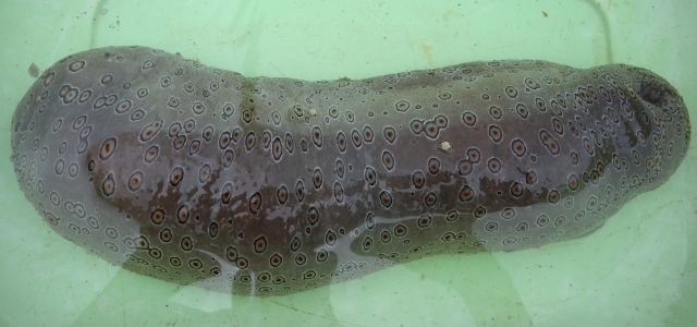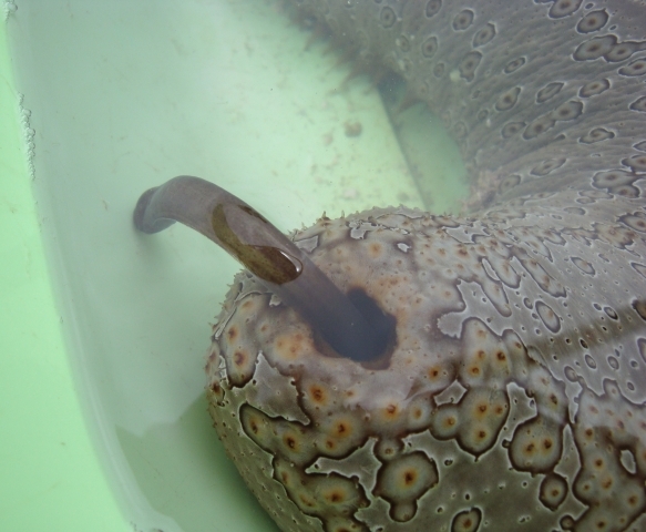 Sea cucumbers, in this case Bohadschia argus, harbor numerous symbiotic animals, from worms to crabs to fish. Some are parasitic, others just hang around at no cost to their big buddy.