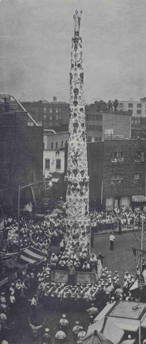 In Williamsburg there is only one tower, “a heavy structure weighing about 4 tons and standing 65 feet in height. The front of the structure is divided into six panels of papier-mache saints, angels, flowers and a map of Italy. On top the giglio is a statue of San Paolino. The tower is anchored on a square platform, large enough to accommodate a band and singer/M.C.” (in addition to traditional music they sometimes play the theme to Rocky and Star Wars). The structure is lifted with attached poles. The Capo Paranza, directs the lifting and “makes constant gestures with his cane, calling out instructions, which are picked up by lieutenants at the corners of the structure and relayed to the lifters. “Four men to a pole, on bent knees, position their shoulders and when 112 men simultaneously stand erect, the giglio is off the ground; it is a lift. There are several lift variations, including a complete rotation (called a 360); a backward march, a quick drop and lift, (called a #2 and a favorite of those who appreciate the difficulty of such maneuver), as well as swaying and bouncing of the giglio.”