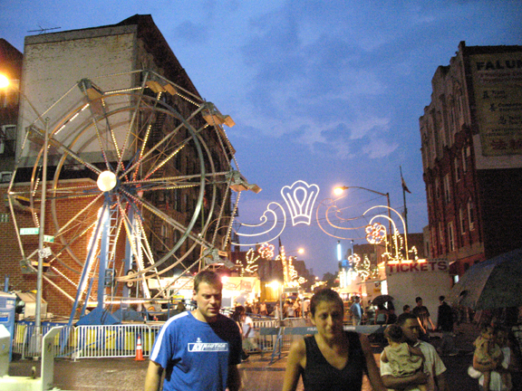 My landlord (who passed away this year at the age of 87 having kicked it hard while he was here) was born into the building I live in - four generations of his family have lived here. I found it utterly surprising to learn from him one day that he had only been into Manhattan about 4 times in his life. The neighborhood was everything. It is not so much like that anymore. However! There are still many Italian Americans here…screaming to their neighbors out their windows, schmoozing on stoops or playing cards on collapsible sidewalk tables when it’s too humid to be inside, and congregating at the Fortunata Brothers coffee shop to drink cappuccinos and eat cannolis or gelato. And there are many, many Catholic rituals that result in marching bands and parades -- they seem to occur, according to my pantheist calendar, for no apparent reason. One of the biggest occasions of the year is the street fair known alternately as the feast of Our Lady of Mt. Carmel (a.k.a the Virgin Mary) or the Giglo Feast, marked by a kinda tacky but fun street fair with bad fried food and kid rides. It's the carnival stuff that us non-Catholics flock to but it is also notable for a bunch of really burly men carrying – no dancing - an extremely heavy and tall statue down the street at varying times. The combined festivals last about two weeks.