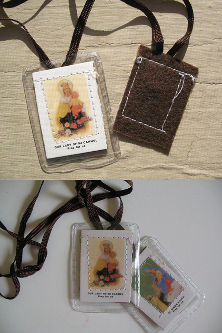 I read the card and opened one of the packets. Turns out it is called a scapular and while it is supposedly a very important item where the 100% wool side faces your body, these were made with a brown sinthetic, shrink-wrapped in plastic, and featuring a “made in china” sticker. So much for honoring one’s materials.