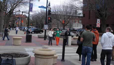 Turning again, I successfully navigated to the Sea of Memes. This part of campus appears to be infested with a Glass And Brick Architecture meme-- there are many buildings in the style to the left. The trees and streetlights may be memes as well-- their placement is quite regimented and I suspect they've been Photoshopped in. This may be an example of copypasta.