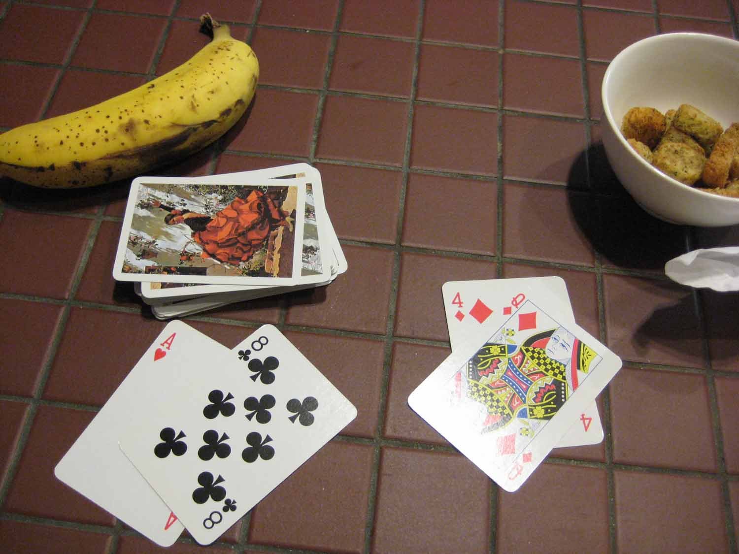 We continued. After a little more play, it became clear that while the croutons had two of the aces, the bananas had the other two: