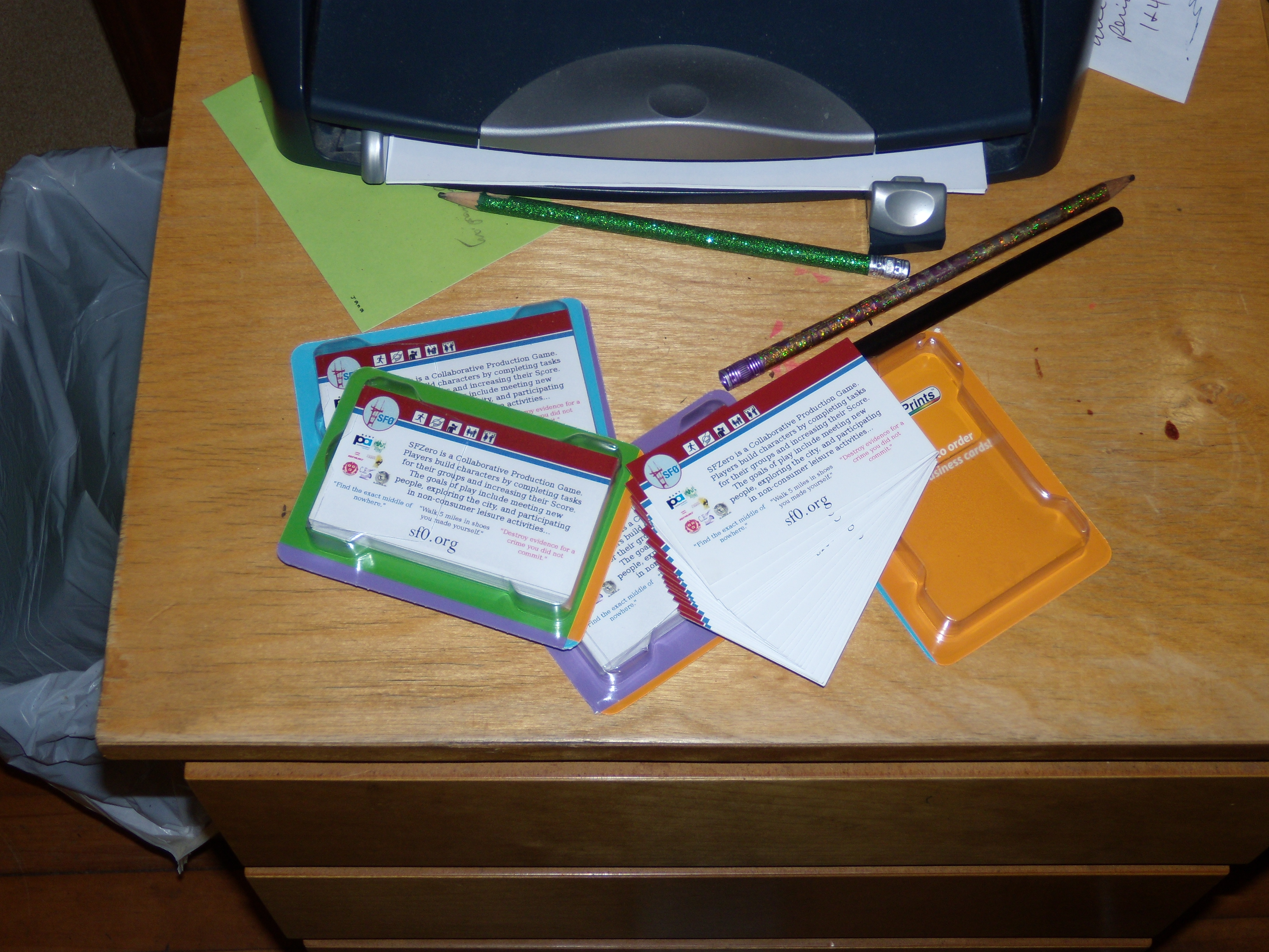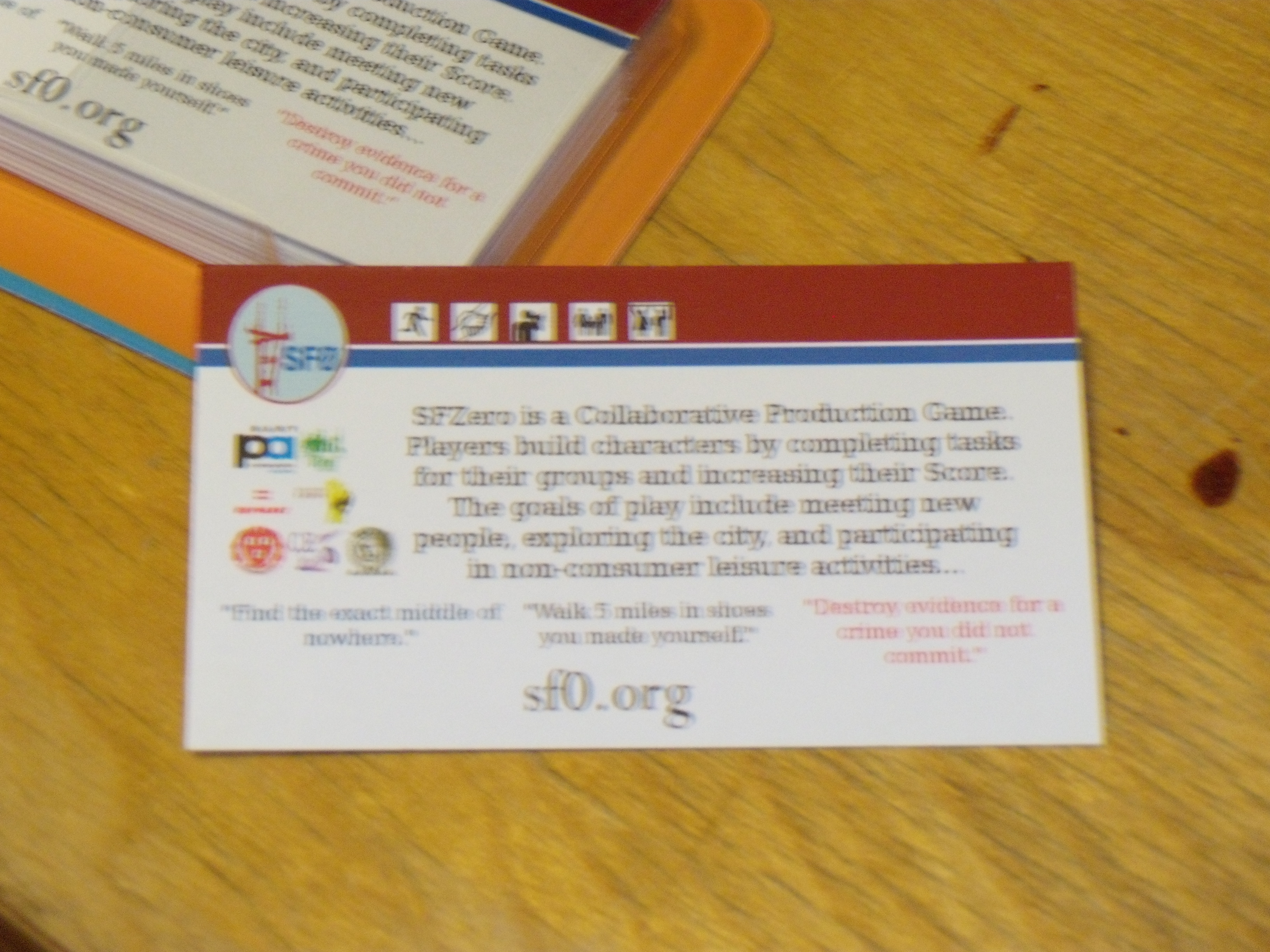I've been dabbling with this task for a while now. My original thought was to just do some (crappy) home made cut out of card stock ones. Then I got to thinking how my brother ordered business cards for his photography for cheap. So I look a place up and lone be hold it's only like 5 dollars for 50. So then I start making rough drafts of them and my original thought was to make a series of cards featuring all the different Grouposis. Then after I was having a hard time with that, the thought struck me that this might not even be the best way to approach new players about the site. So then I got the idea to make the SF0 home page into a layout, add a little editing, new layer here, inert text there and BOOM! Totally legit Sf0.org business cards!