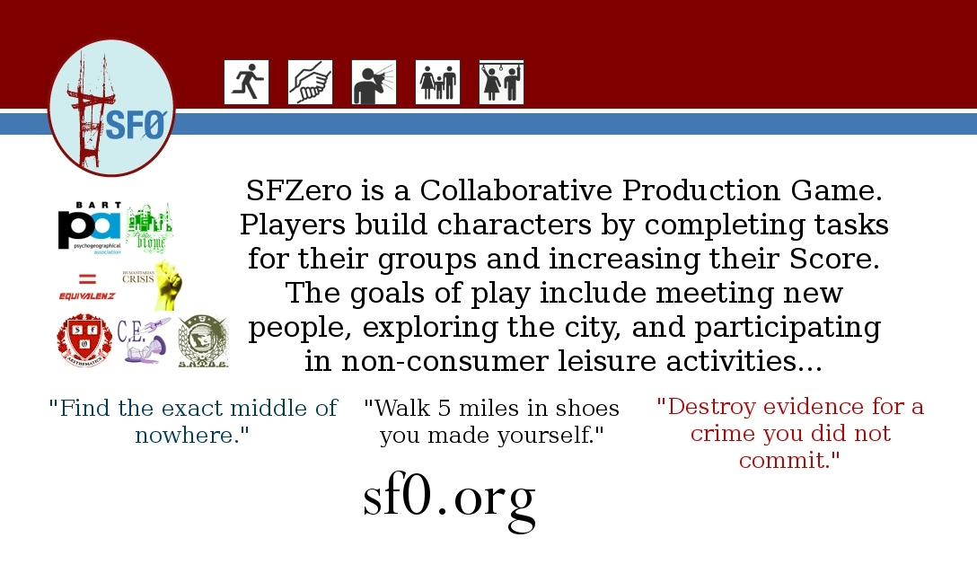 TEAM: MNZero TEAM: NCCCZerø BART Psychogeographical Association Rank 6: Lettrist EquivalenZ Rank 2: Human Googlebot The University of Aesthematics Rank 3: Graffito Humanitarian Crisis Rank 2: Justice Biome Rank 2: Ecologist Chrononautic Exxon Rank 1: Clockwatcher Society For Nihilistic Intent And Disruptive Efforts Rank 5: Cheater