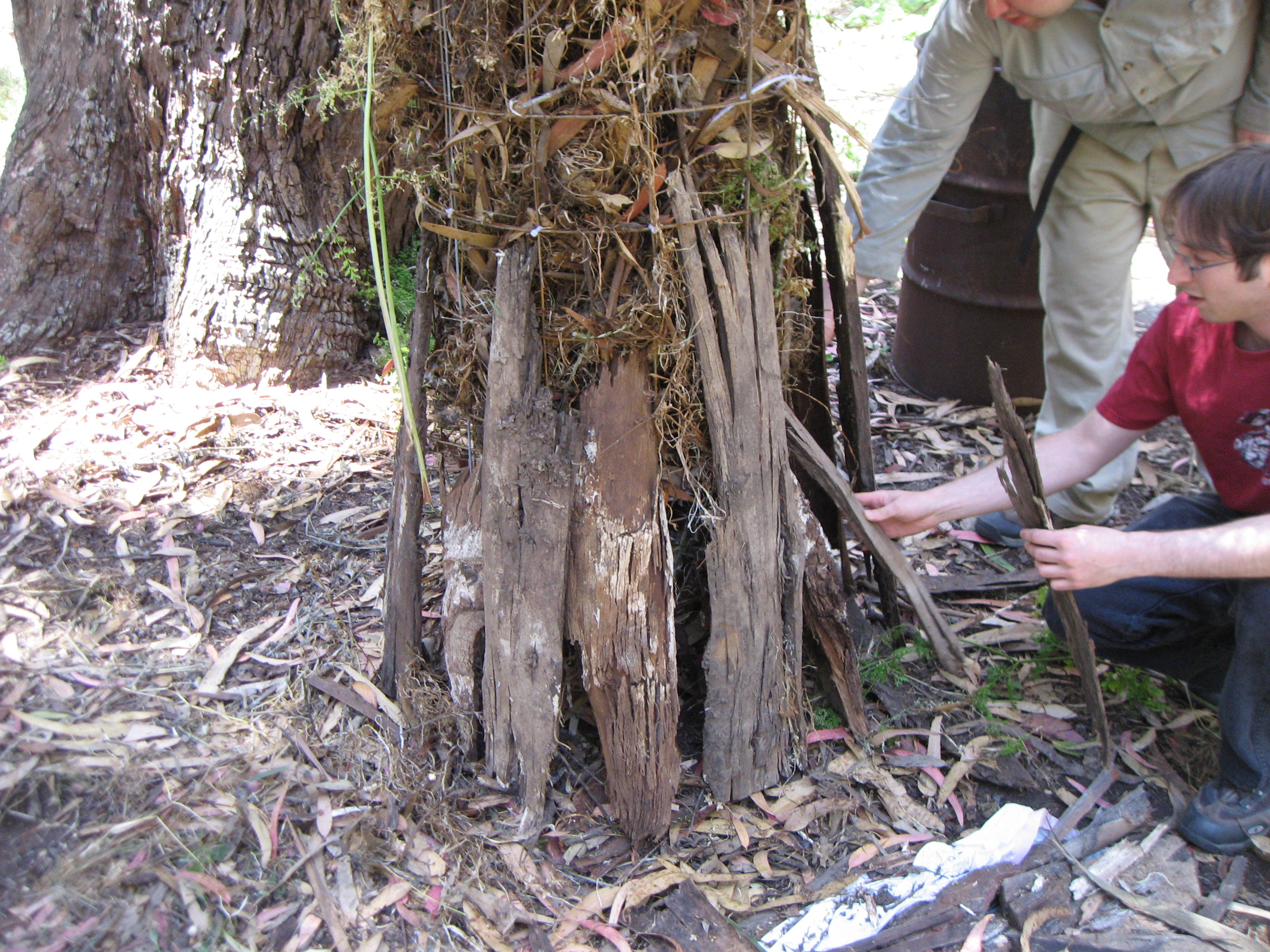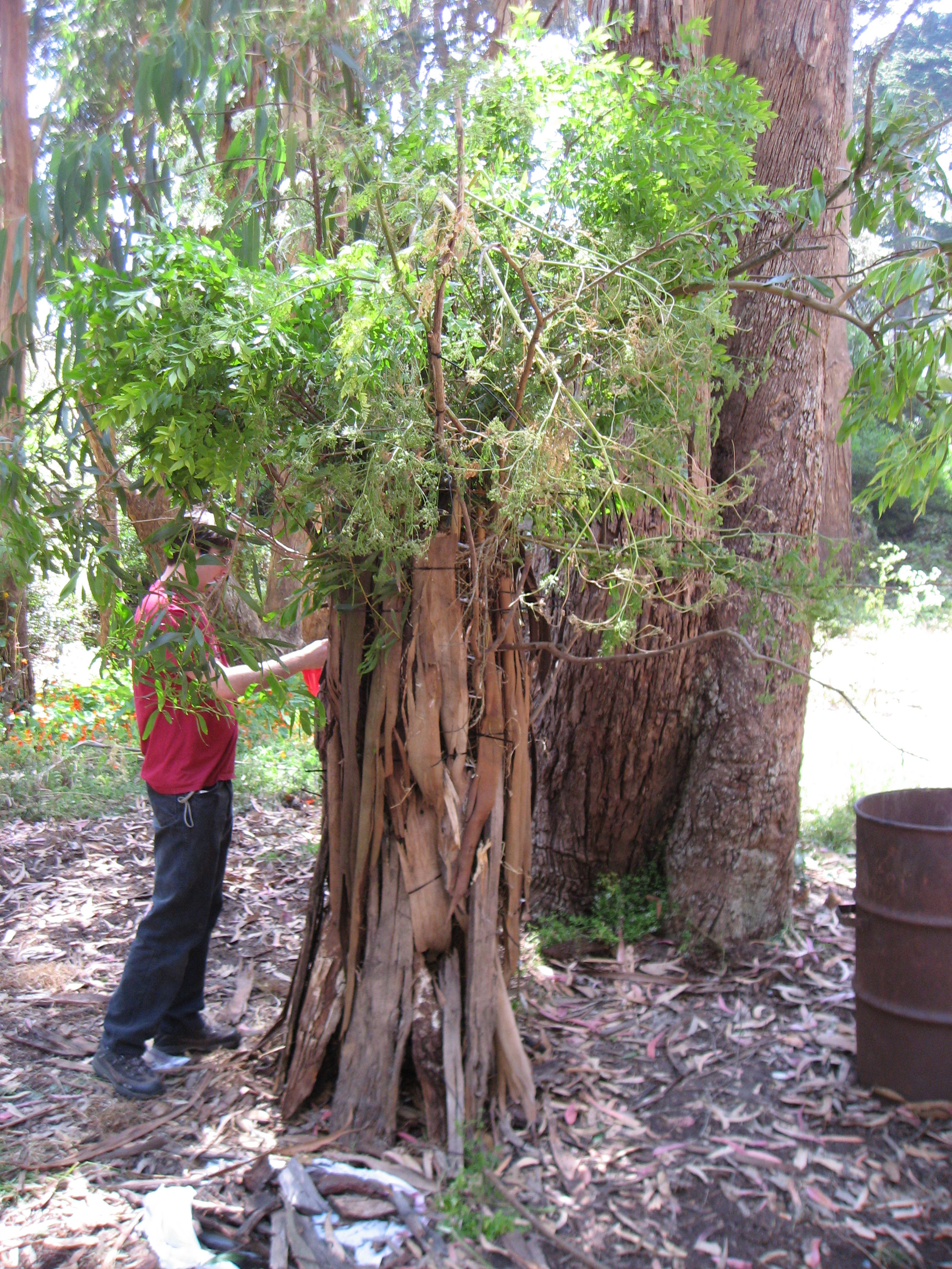 big planks of wood, a few boards, small fence posts, sawX2, mallet, axe, hatchet, shovel, string, cherries, bananas, new years cuffs, brown and green spraypaint, and most importantly, some large wire mesh sheets. The others brought a very nice variety of stuff too. We made an awesome tree and as usual, this was a lot of fun. It was fairly sturdy and simulated quite a few tree functions too: