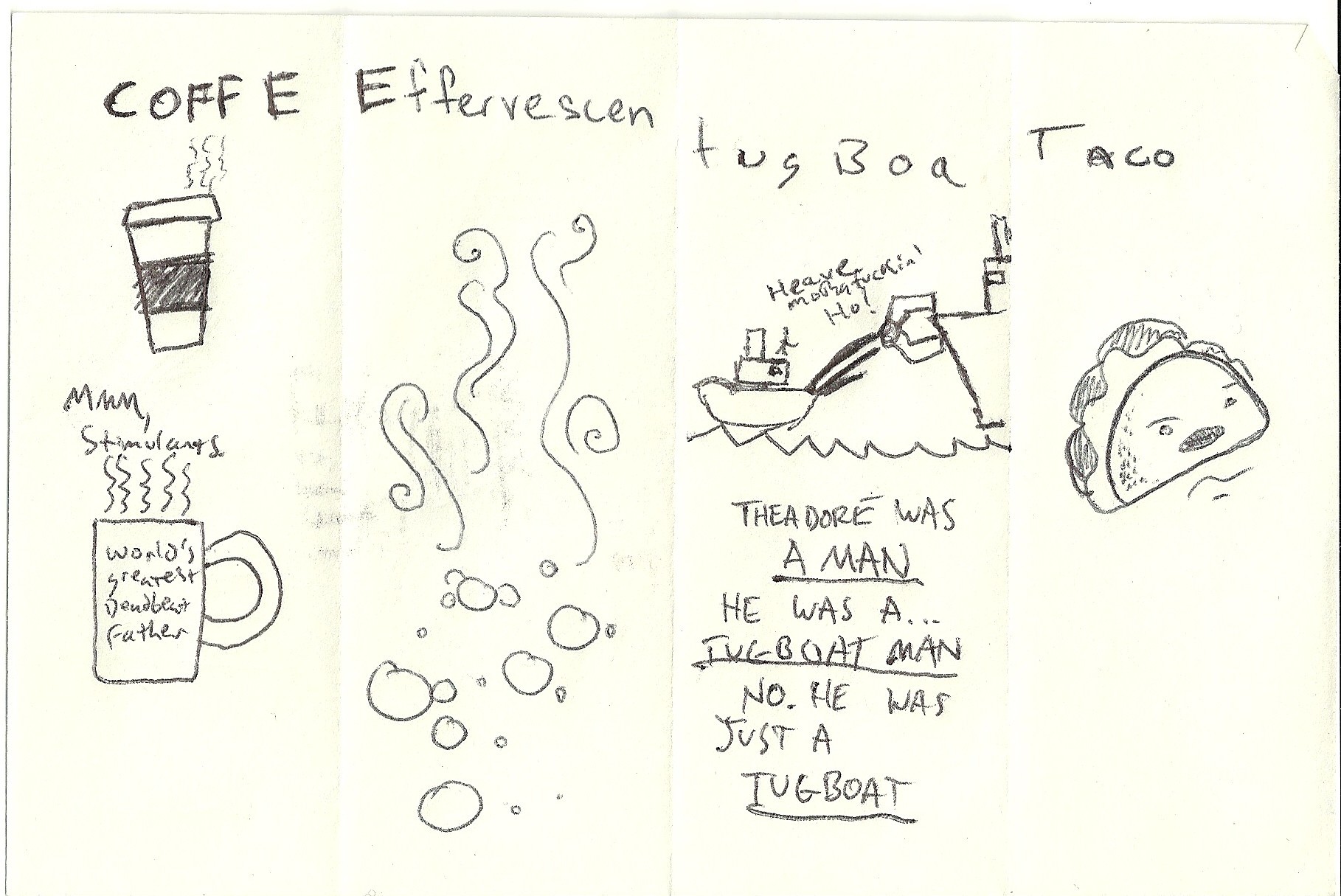 Well, inside the most politically fucked and delicious establishment "Philz Coffee" I took pen to ripped out sheets of notebook paper with Madeline at a table in the back of the place. We then proceeded to play a quick game of chess, permeated with bad sex jokes and a comment about if Madeline had two kings, they would both be queens, and hence she would get two queens...