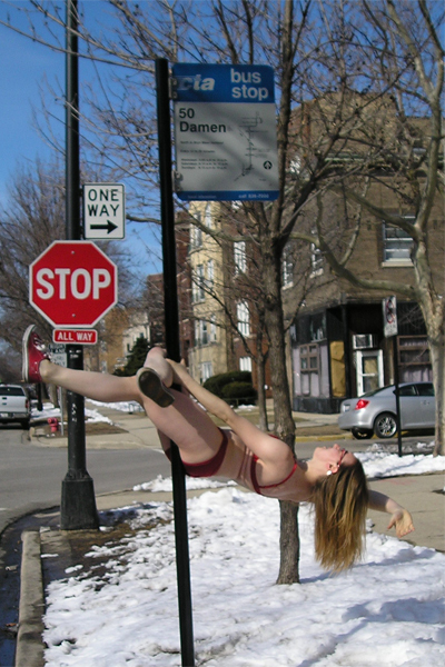 Pole dancing is HARD! We looked at some moves and poses online, and picked a few things that looked pretty easy to try out on a practice run a few nights before the real deal. We couldn't do any of them! Pole dancers are seriously ripped. Later, when it was showtime, we learned that having bare legs really helps when it comes to gripping the pole; on our practice run, in our jeans, we were sliding all over the place and afraid to try anything upside down for fear we would land on our heads. Clothesless, it was far easier than we first imagined. We also learned that a bus stop pole is much larger in diameter than a real stripper pole, as in all the videos we watched, the dancers were able to grip around the entire pole with one hand, which could not be done on a bus stop pole. Having a good grip is essential; it became apparent that a few moves which were very difficult at the bus stop would be easier on a real stripper pole. And lastly, bare metal is much harder to grip onto than the painted bus stop poles, which is why the closest bus stop to us couldn't be used, so instead of Montrose we headed to Damen. Oh! even more lastly, for the really fancy upside down and spinning moves, you need a lot of height, and bus stop poles are disappointingly not tall enough.