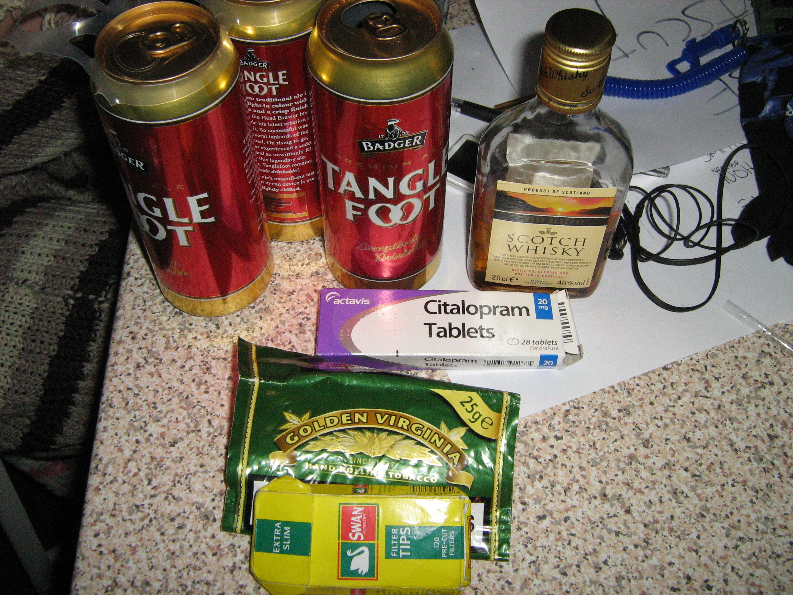 Good beer, Check Cheap whiskey, Check Medication 20mg Citalopram, Check Tobacco and other affiliated items, Check LET THE MADNESS BEGIN!
