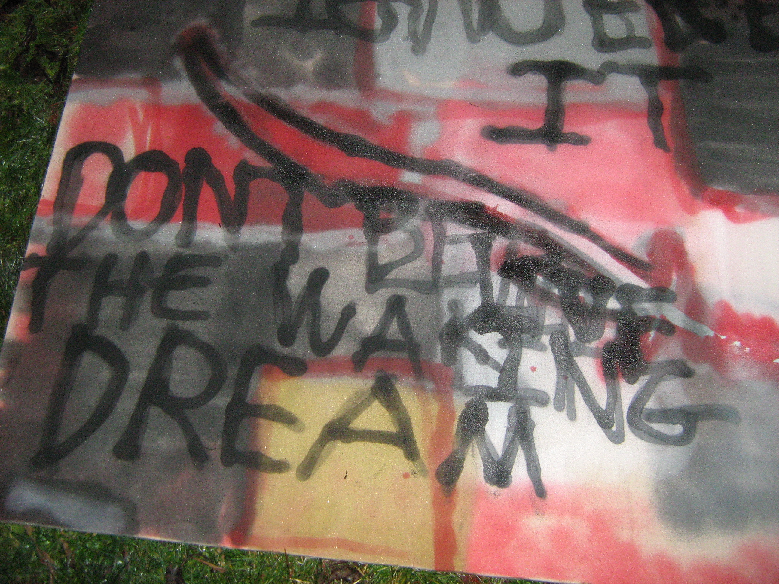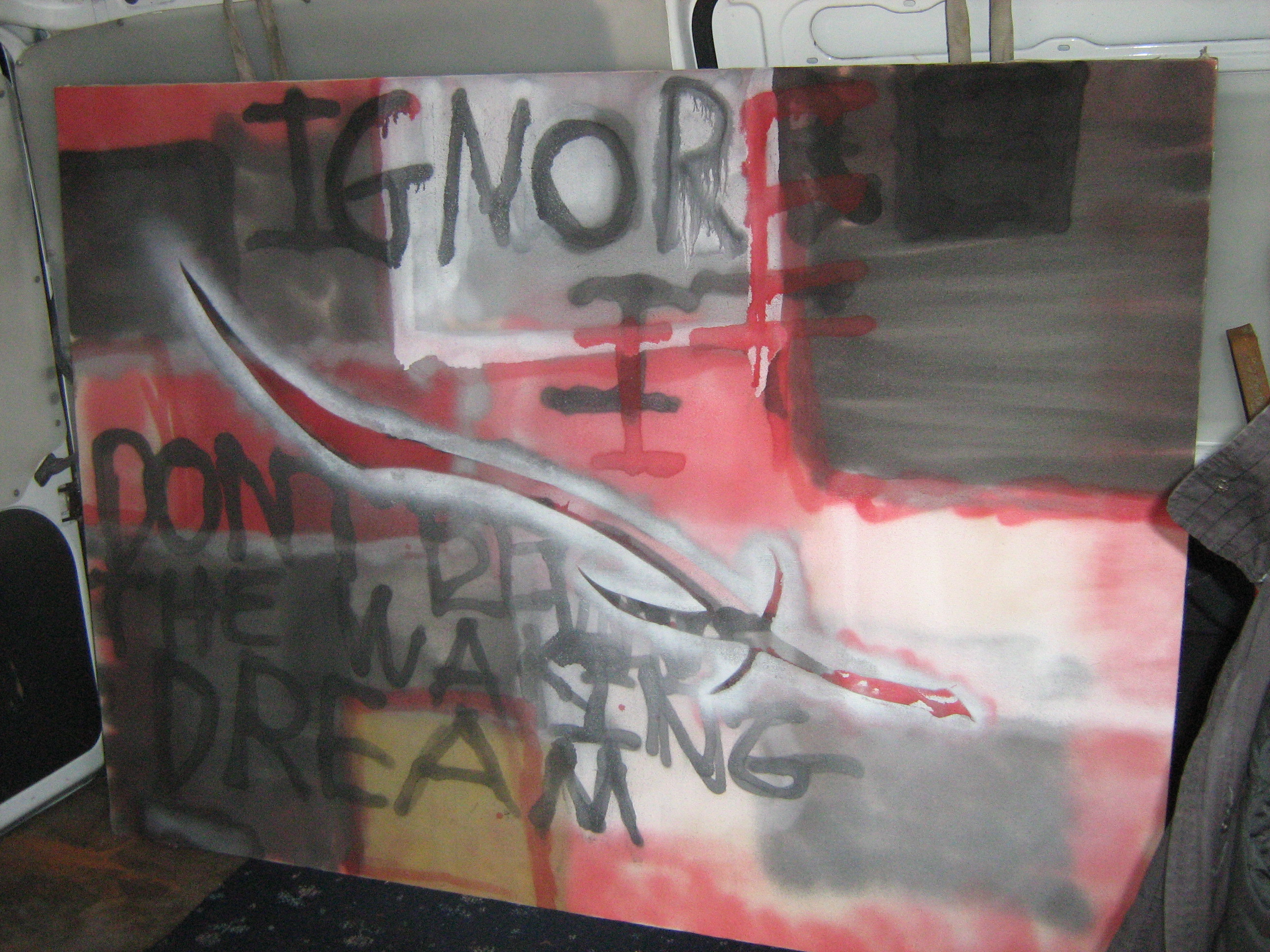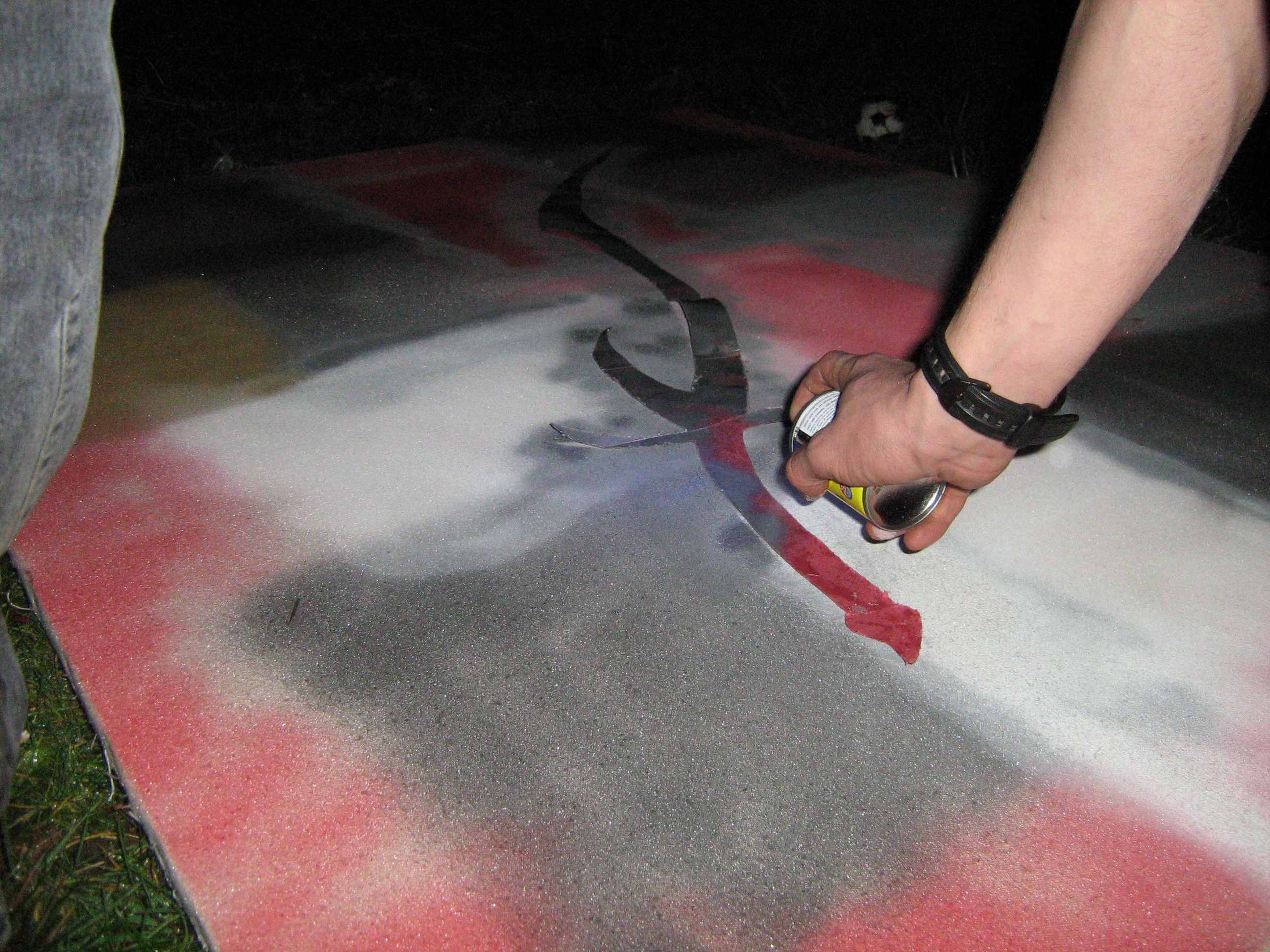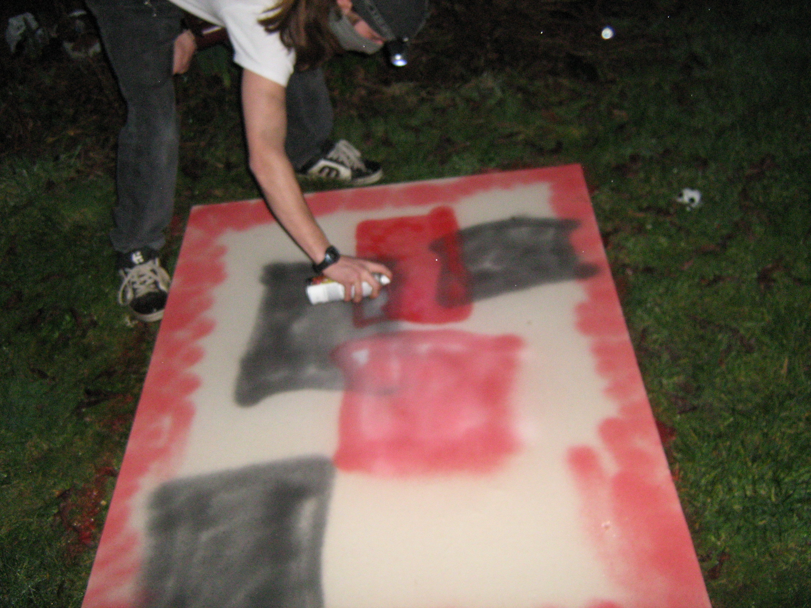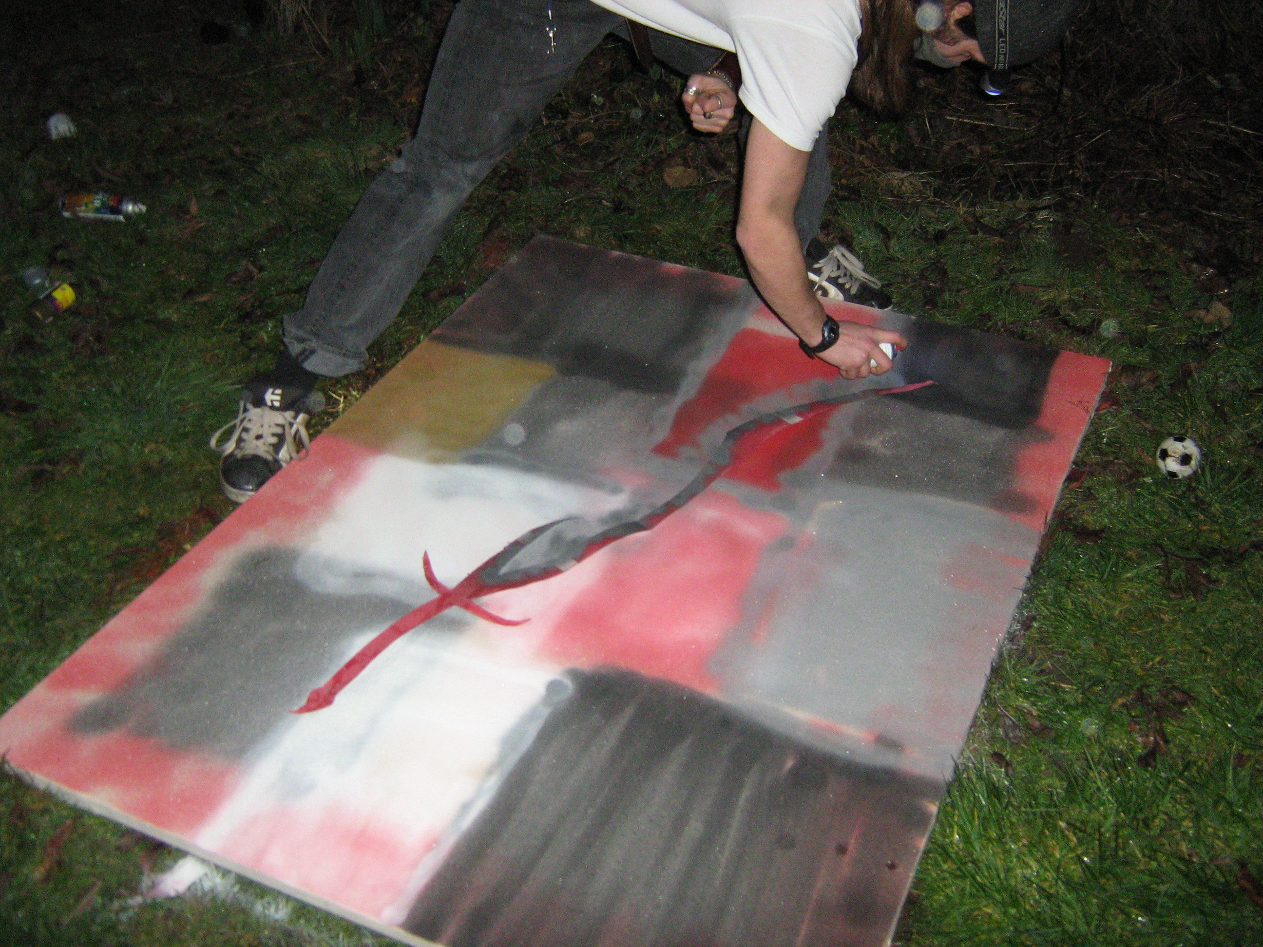 My finished "art" I think its rather good considering i could only just about keep my balance whilst doing this. The only planned thing was the sword in the centre the rest i just did as it popped into my head hence why its so messy my mind was rather absent during the creation so there was alot of spelling mistakes i had to re-spray. All in all i quite enjoyed this task, I got drunk and was creative what more could i want in an evening?