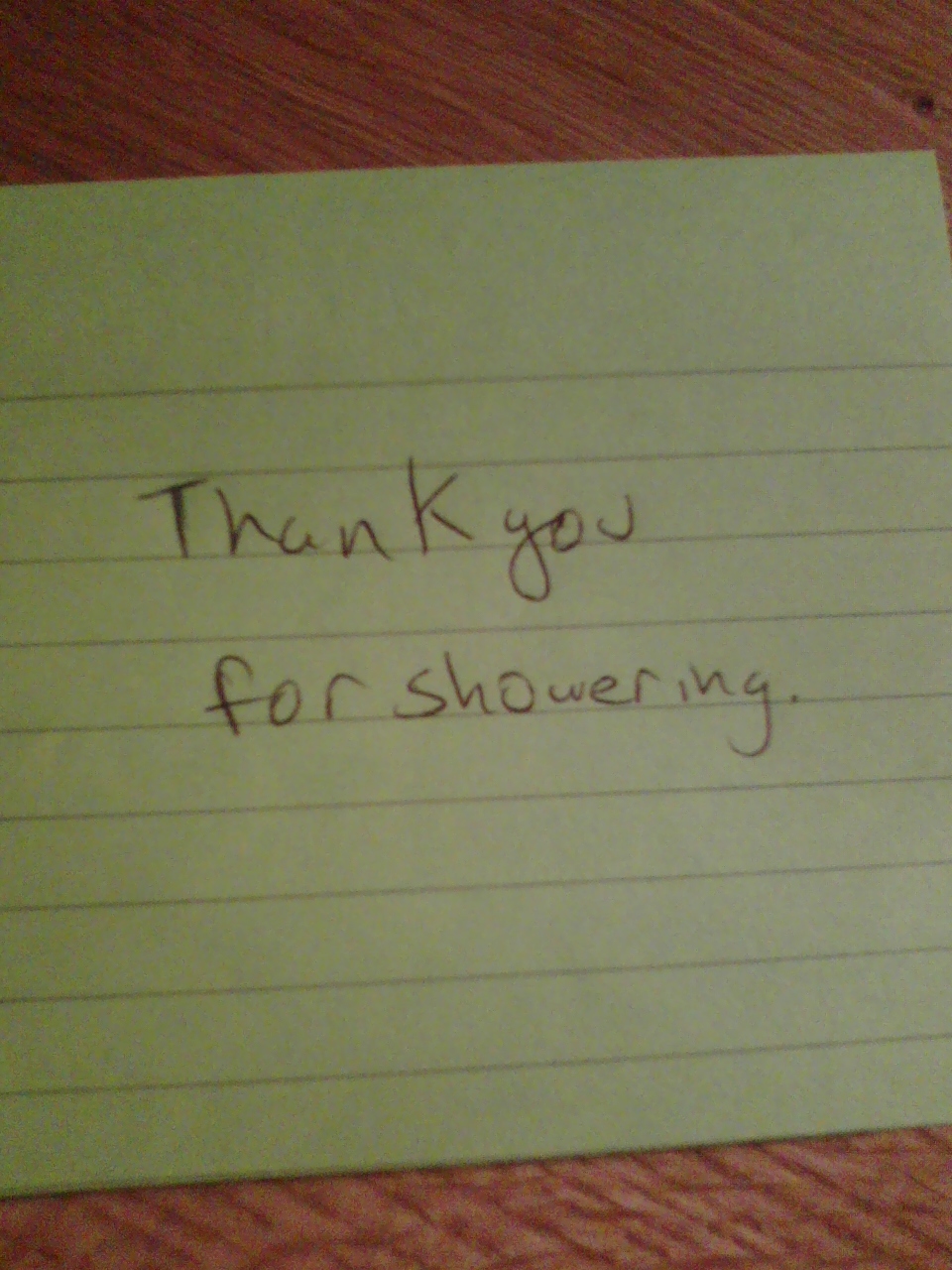 It only took me a few minutes to post my simple thank you signs, but I hope that someone appreciates them and/or gets a little laugh out of one of them. The best part of the process was posting the 'thank you for showering' signs. There was actually a guy in the shower when I posted the signs, so I did it really quickly and ran out, I really hope he doesn't think it was aimed at him!