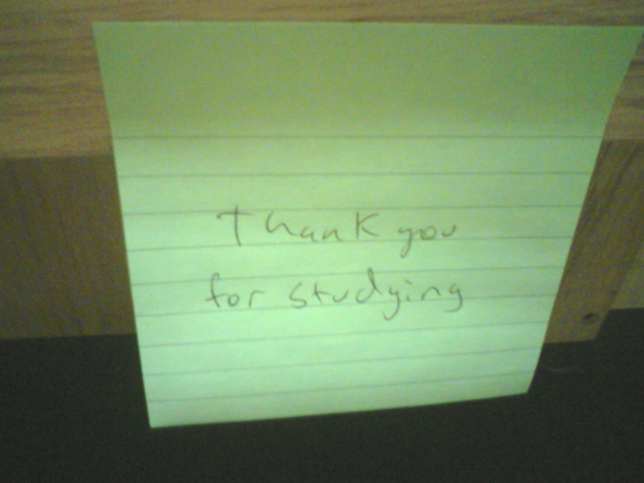 Since the thank yous were simple and everyday, I chose a medium that was also simple and everyday: green sticky notes from Meijer. I posted them around my dorm thanking people for showering, flushing the toilet, doing laundry, studying, and recycling. These are the things that I think make living in the dorms bearable.