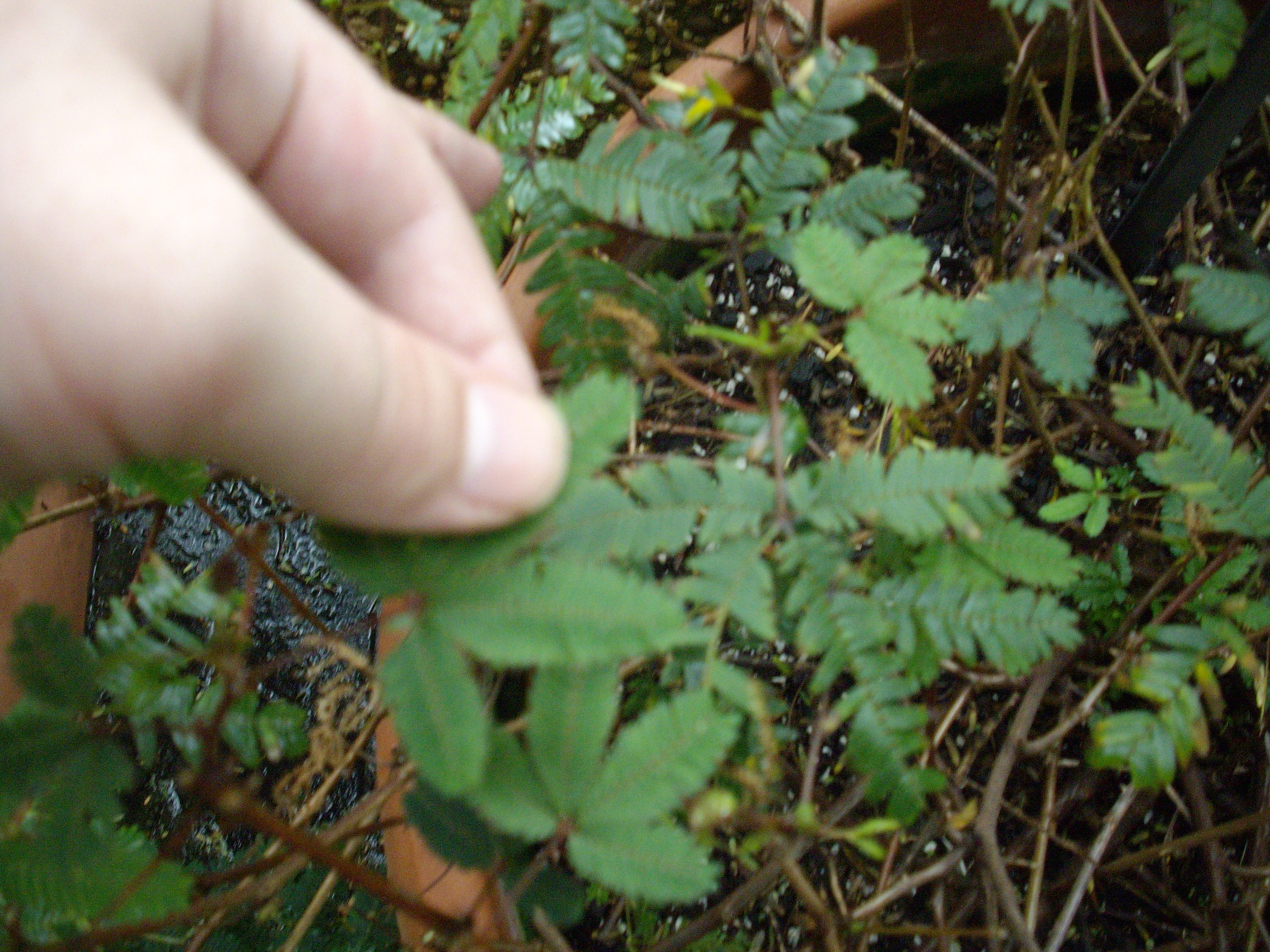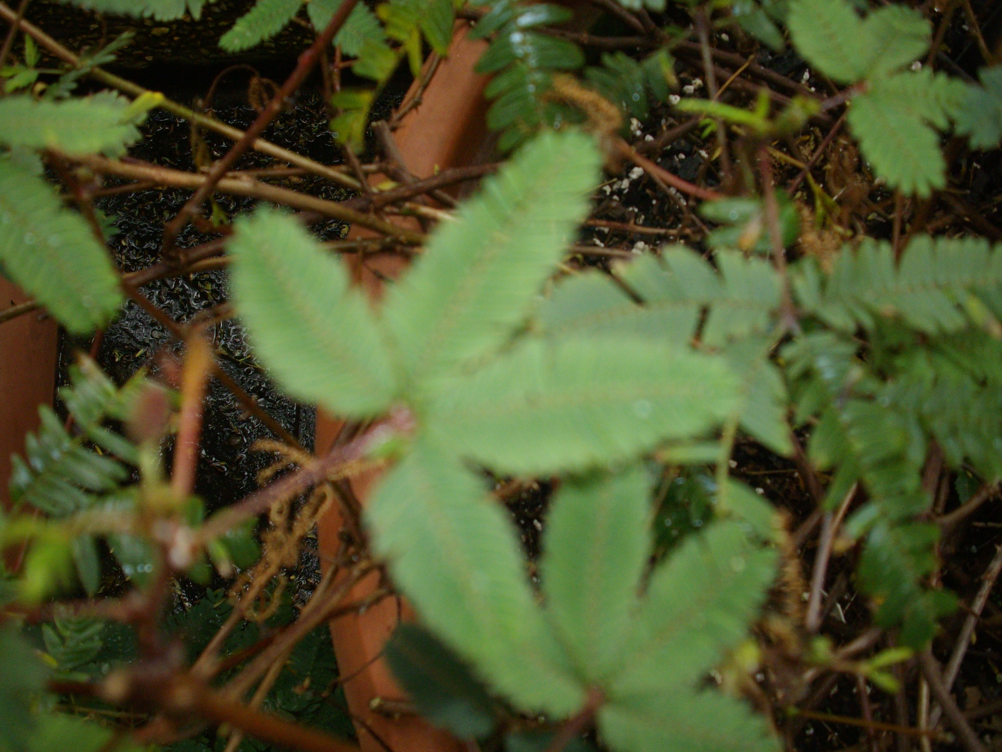 A close-up of the Sensitive Plant, before it's been touched--notice that the leaves are completely flat. Sorry for the poor focus, but hopefully you'll be able to get the gist between this and the background.
