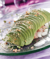 Cut each avocado into 8 slices. Diagonally wrap each with a