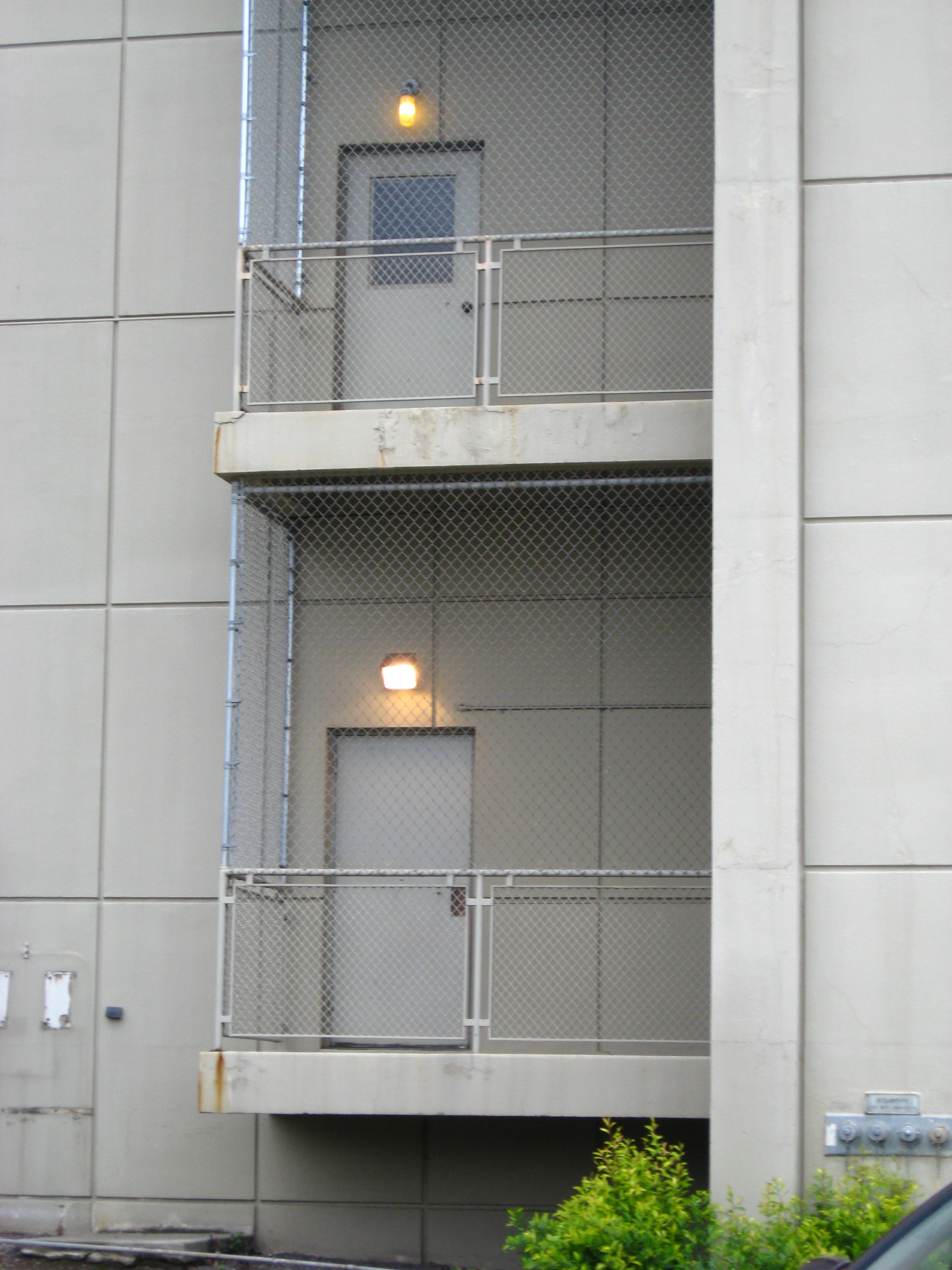 Even the lower level windows were covered with fences. I wasn't going to get in. Circling the building had brought me to another main street. While I was looking for entry points, it had begun to rain. I pushed down the street, but the wind picked up and the rain continued.