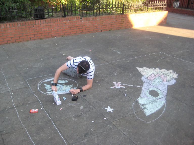 Chris again lept into the social breach -"It's a public art thing to brighten up the neighbourhood. I'm working in chalk because I draw like a four year old! (endearing urchin grin)"