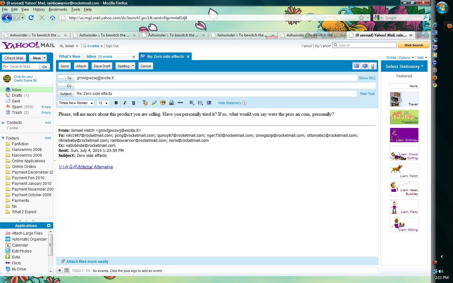 July 31st, 2010 6:33 PMI recieved a notice for Viagra, which really wasn't exactly proper advertisment, as, I myself, am a lady. Still, I do have a significant other (cartmaster chris) and so I decided to respond on his behalf, because I hear that in men's mid 50's to 60's their junk starts to slow down, so I might as well get a head start on the research.