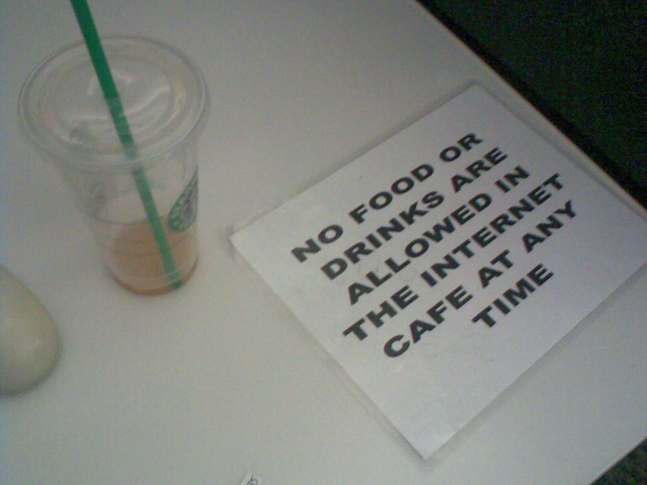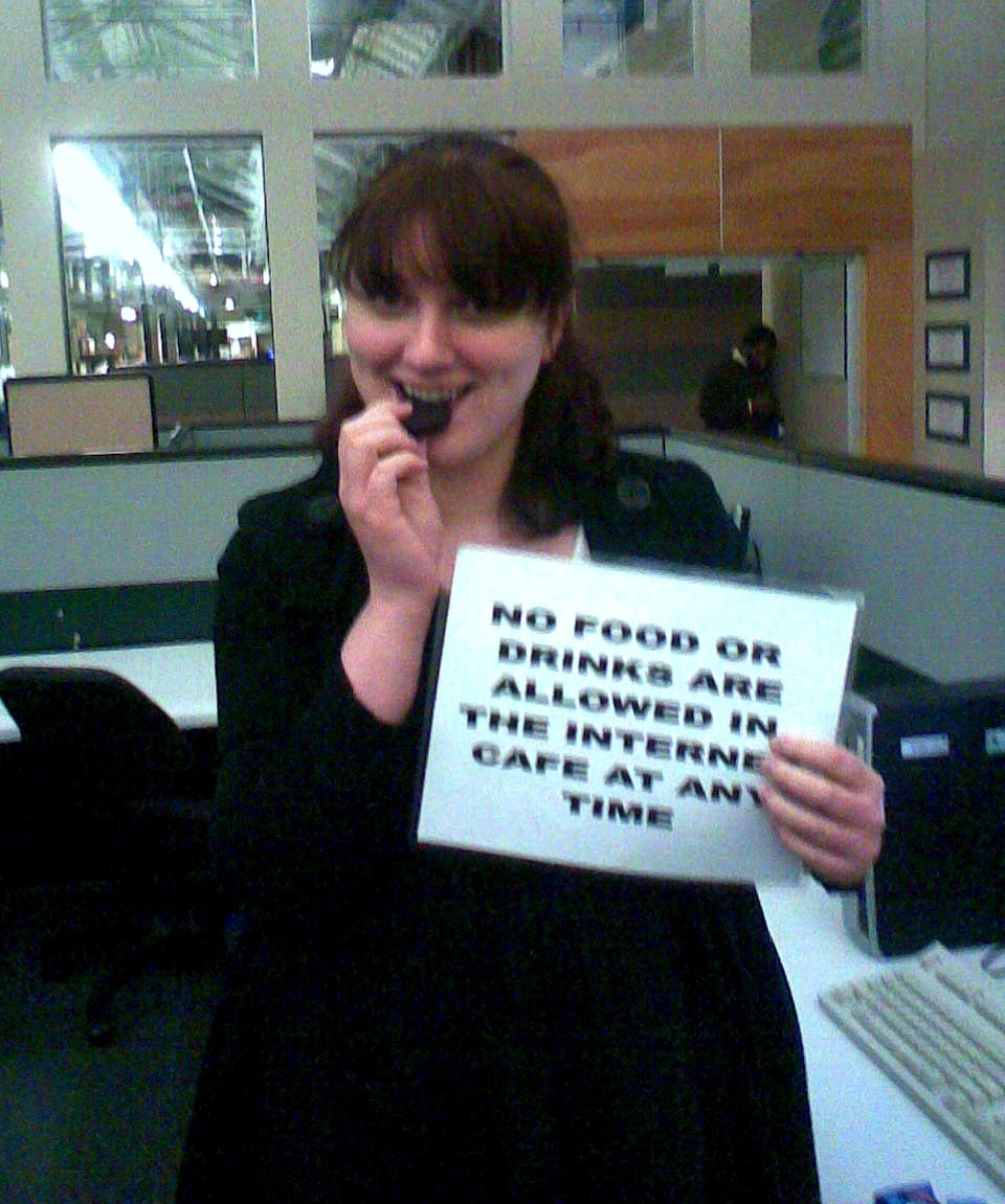 So I was at work and eating in the internet cafe when a fellow employee walked by and cleared their throat and then pointed out yet another bane of my existence. Absolutely NO FOOD OR DRINK ALLOWED in the computer lounge at any time.
