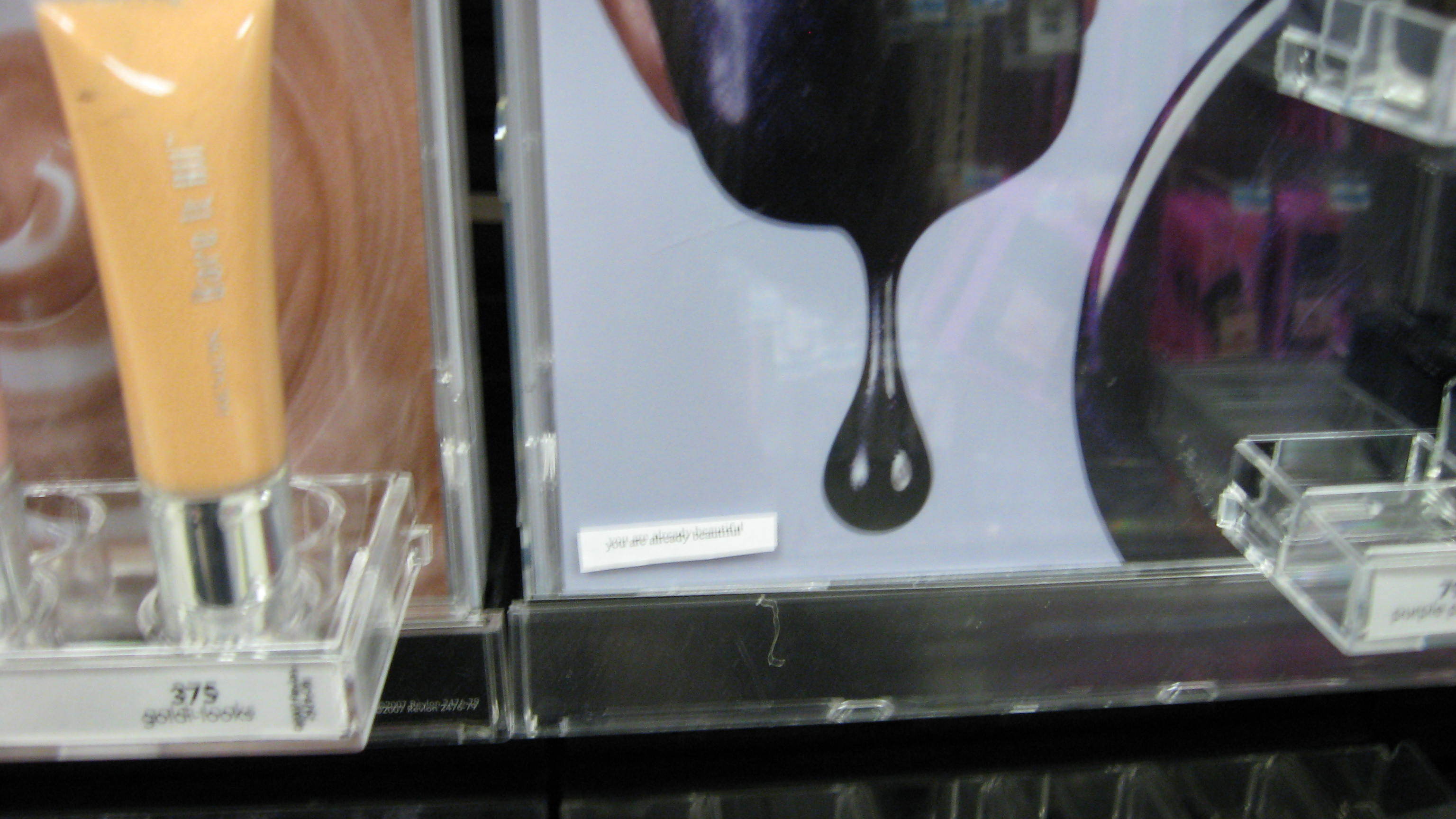 January 6th, 2008 12:24 PM"You are already beautiful"-to be placed on fixtures in the beauty product section
