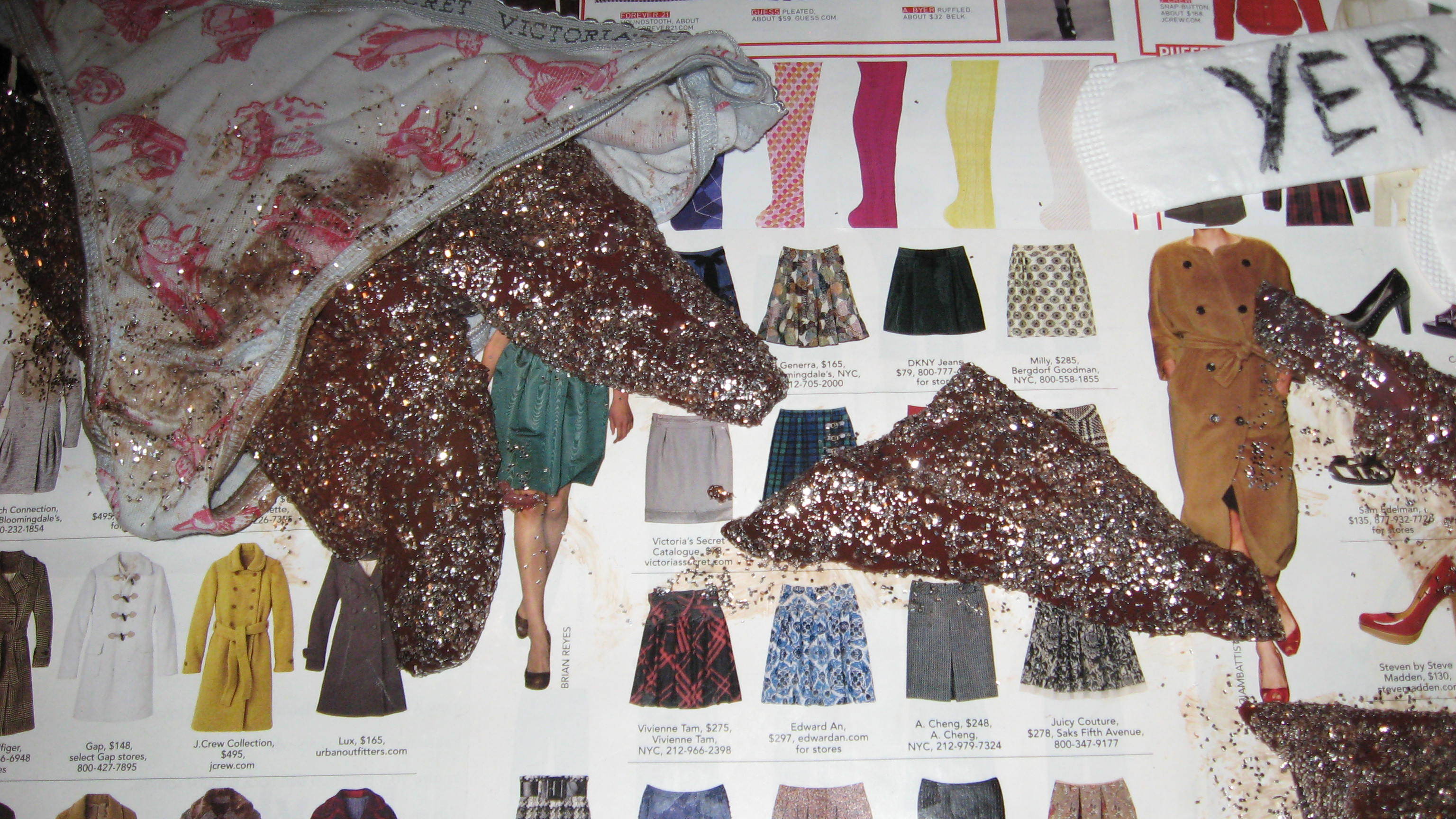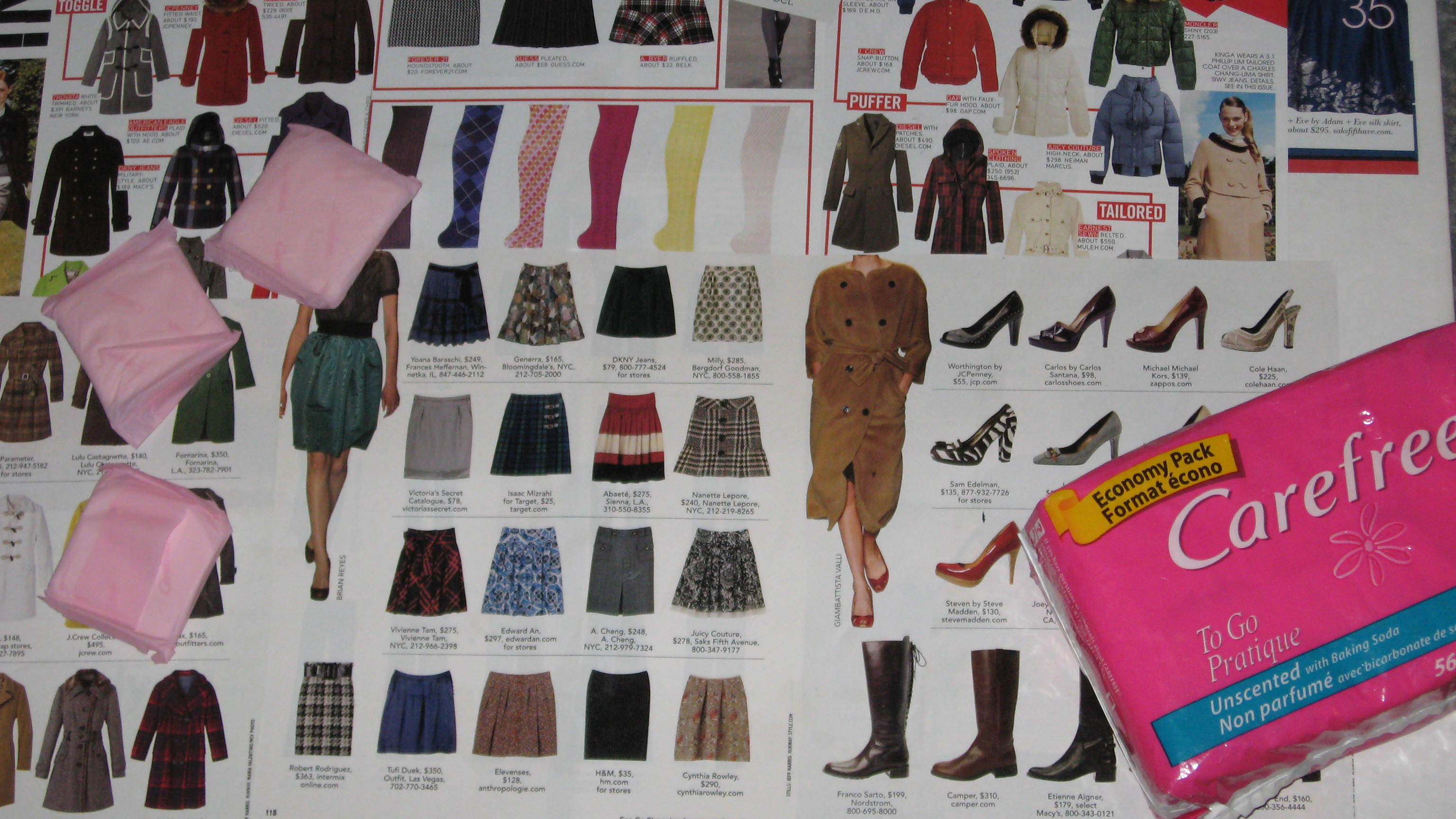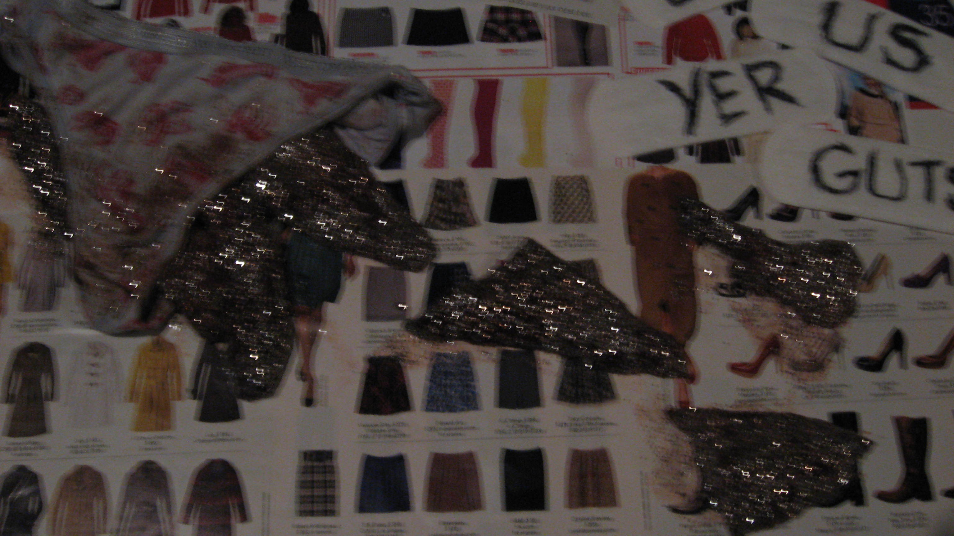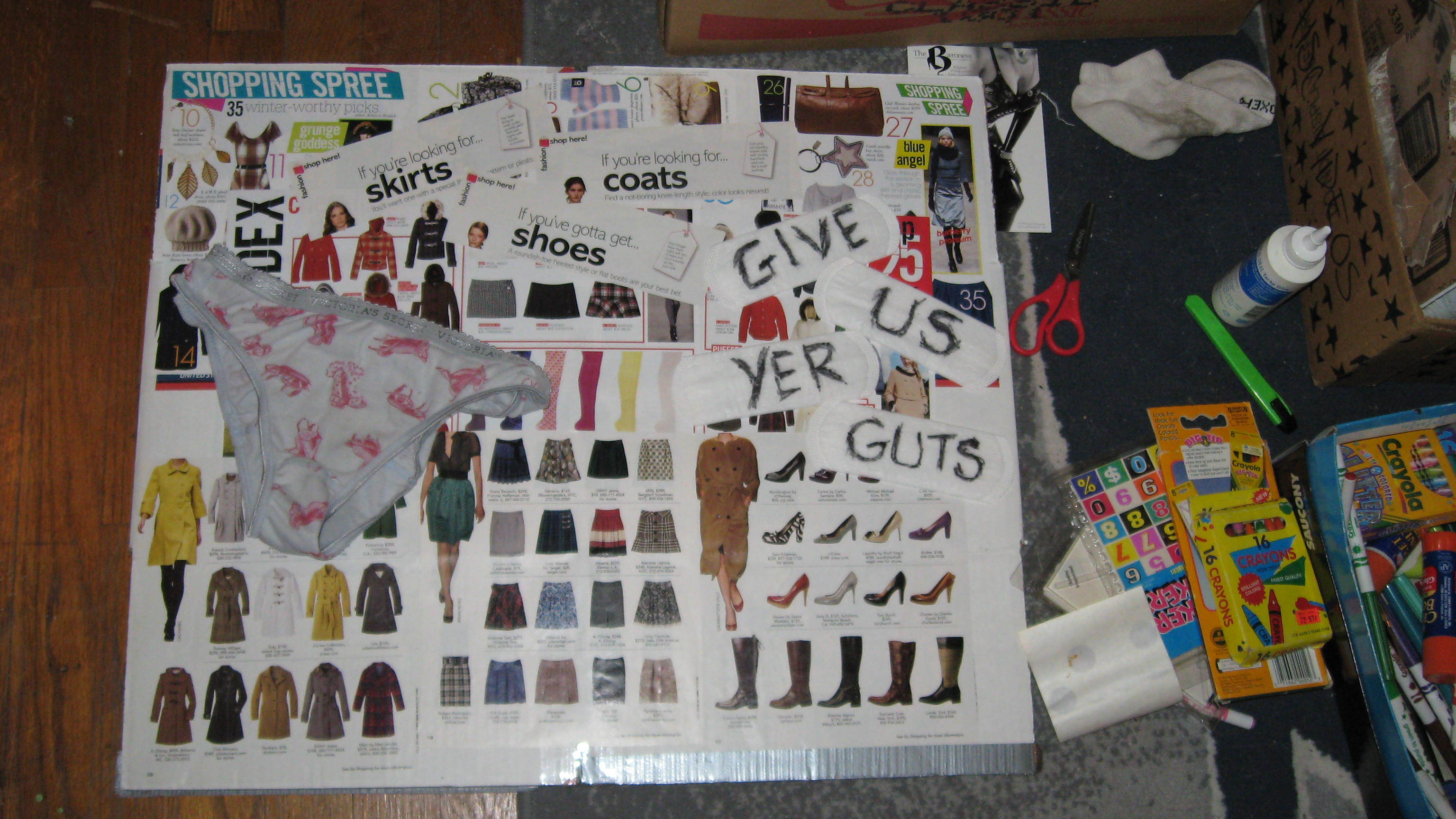 January 5th, 2008 4:31 PMI wasn't really sure what was going to be made. While considering what to do with my friendly neighborhood organ meat, I came across these pages of an old Seventeen magazine (I find it important to note that I do not read Seventeen but was given the issue by a friend who knew I would like some of the photos) that I had been saving. I save random things from magazines a lot because I never know when I might find somewhere to glue them or something to make from them. The pages got my mind turning and from there it was all panties, panty-liners and glittery liver.