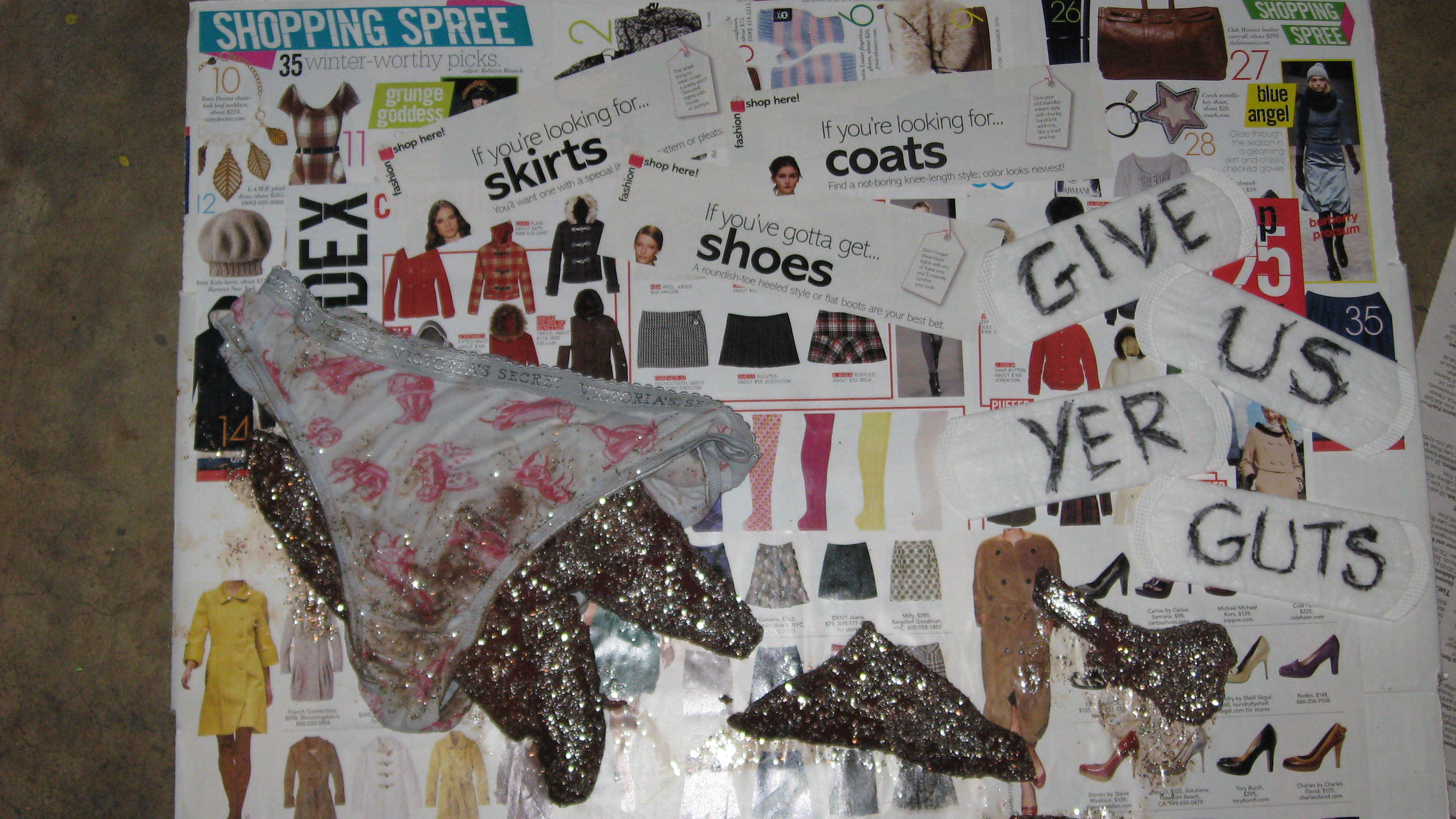 I wanted to write more in my proof about the idea behind this glittery gross piece, but my words seem to be failing me this evening. The combination of fashion ads, from a magazine that I personally see as poison, that ask if girls need this or that combined with feminine items and guts that are meant to be traded in for these "must have" items just makes sense to me. I s'pose it is my own disgust is what fueled the making of this. I wasn't even really thinking of the most basic gross out part of it. :)