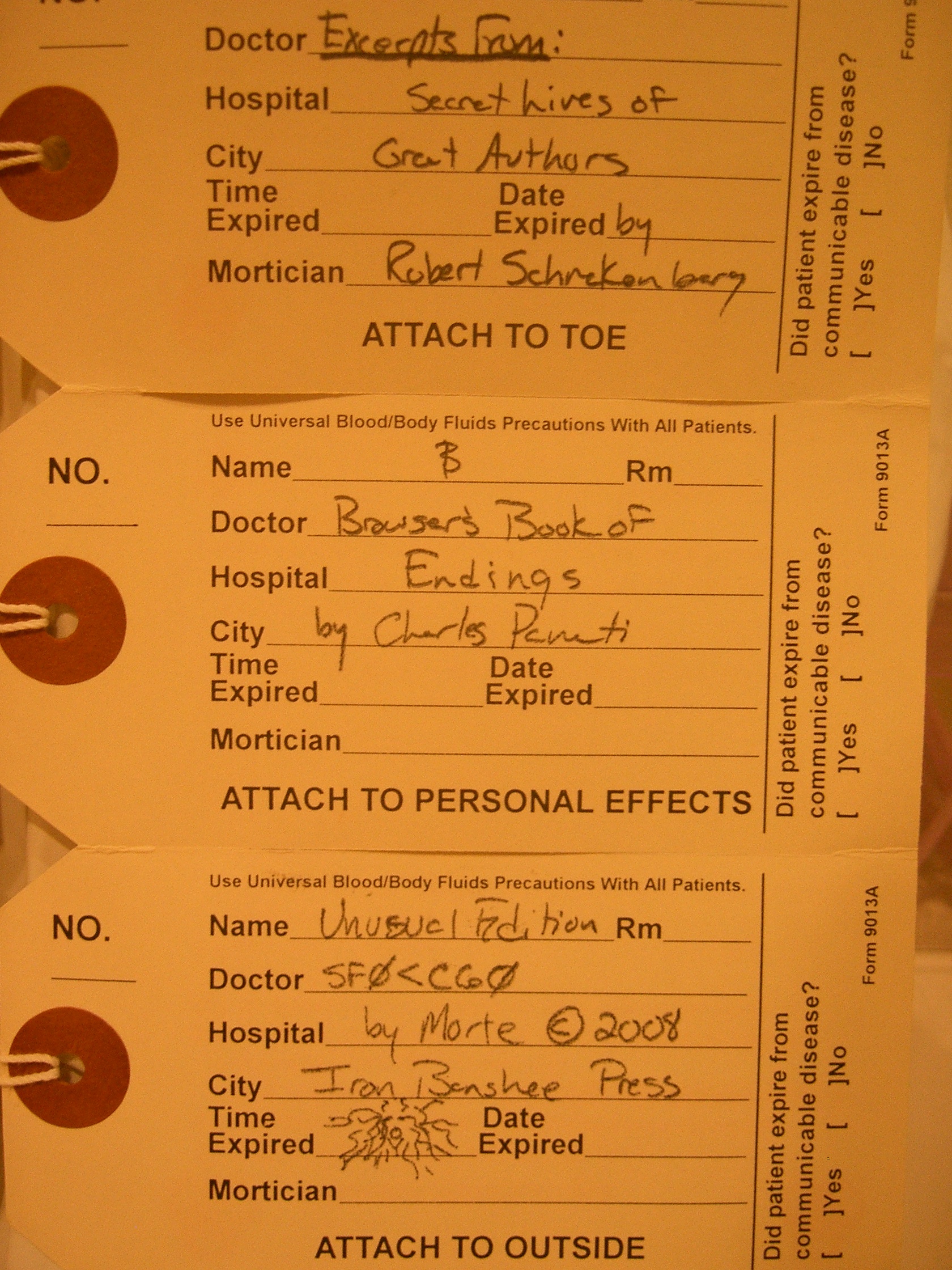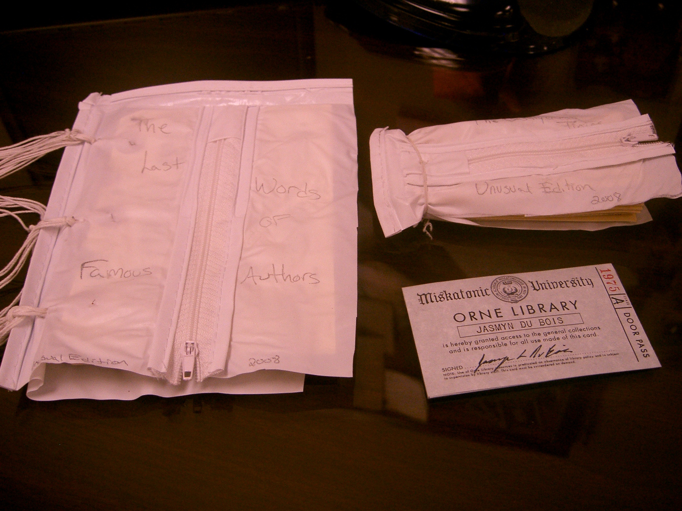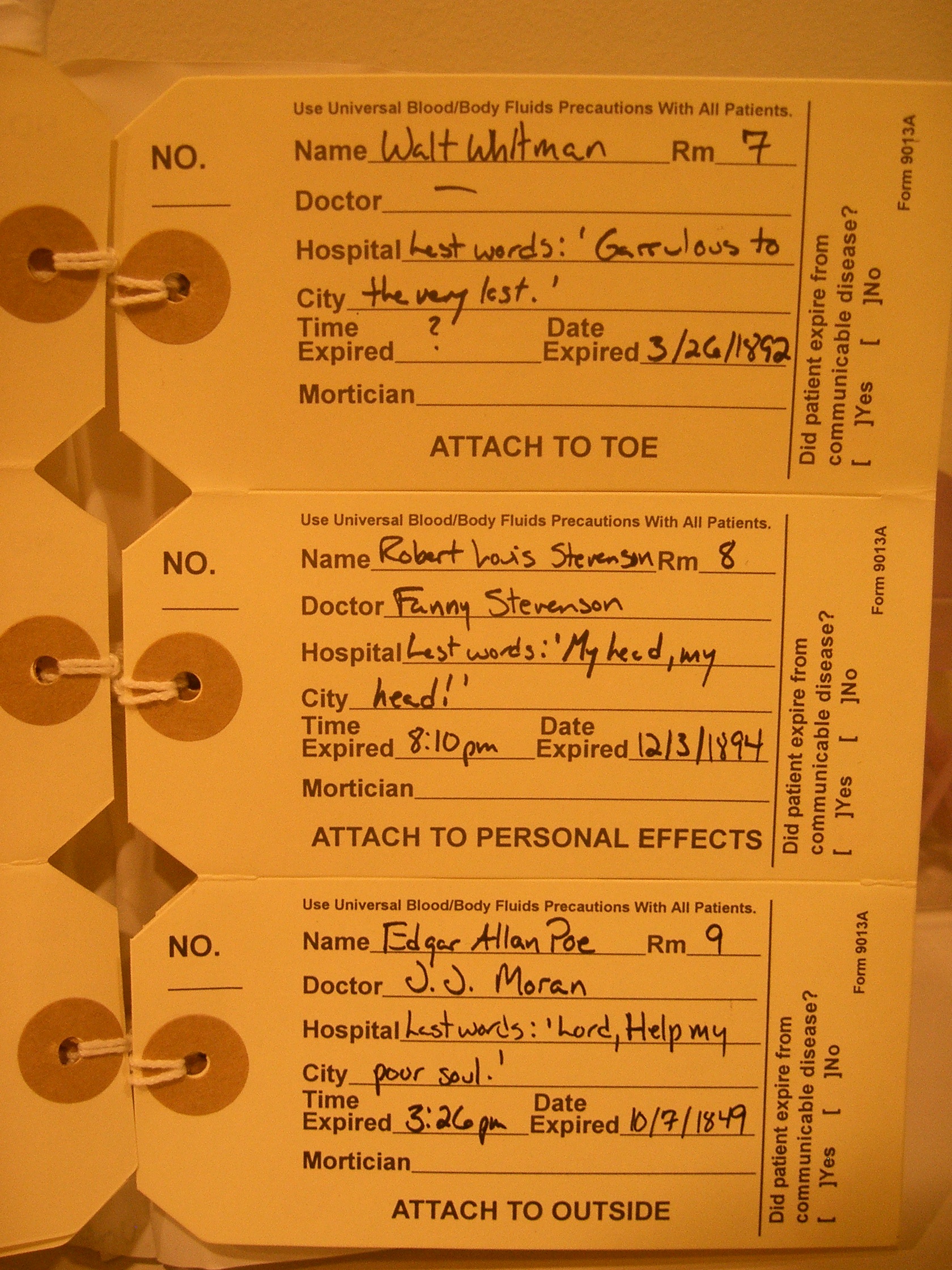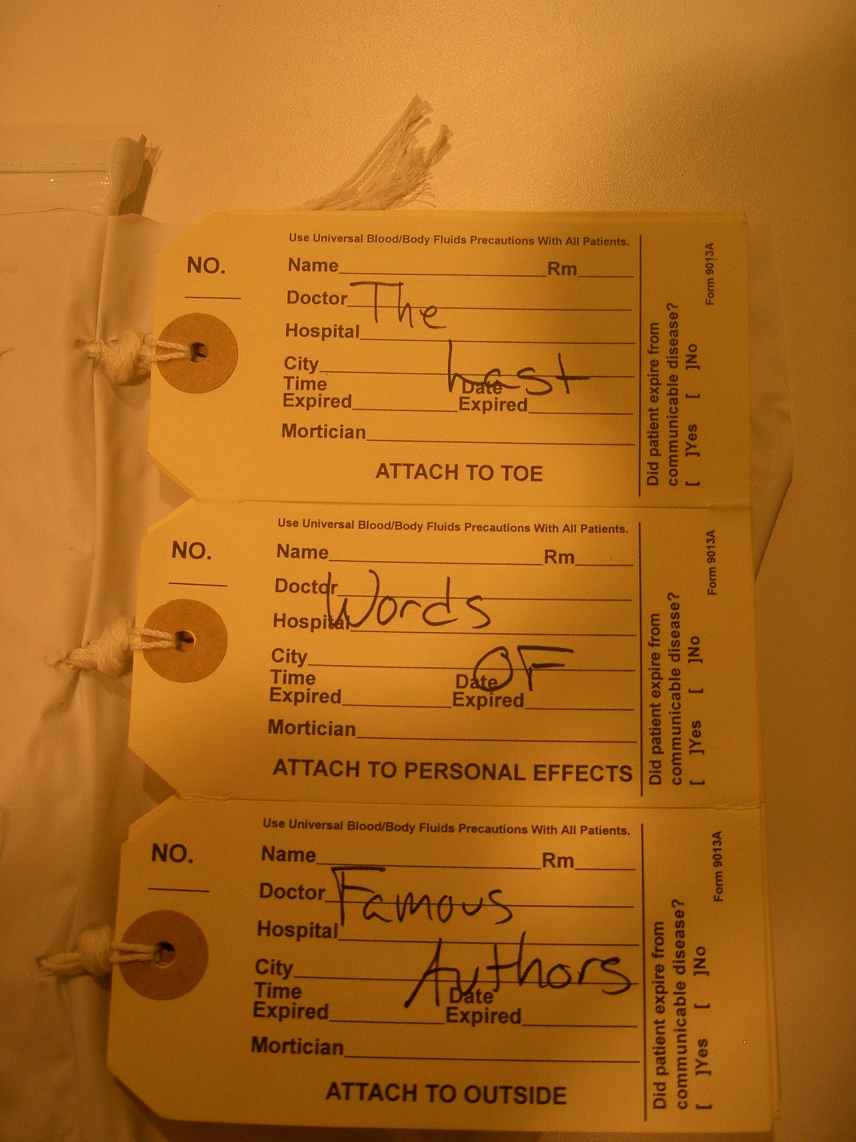 This satisfied my desire to have the content of the book connected to the materials, and for it to be something about reading or literature. Then I thought if I was making a book about learning the alphabet and learning to read, I should also make a book about dying, somehow connected to reading or literature. Then the thought occured to me, why not make one about the last words of famous authors? I had two different kinds of toe tags, so I could make two different kinds of books.