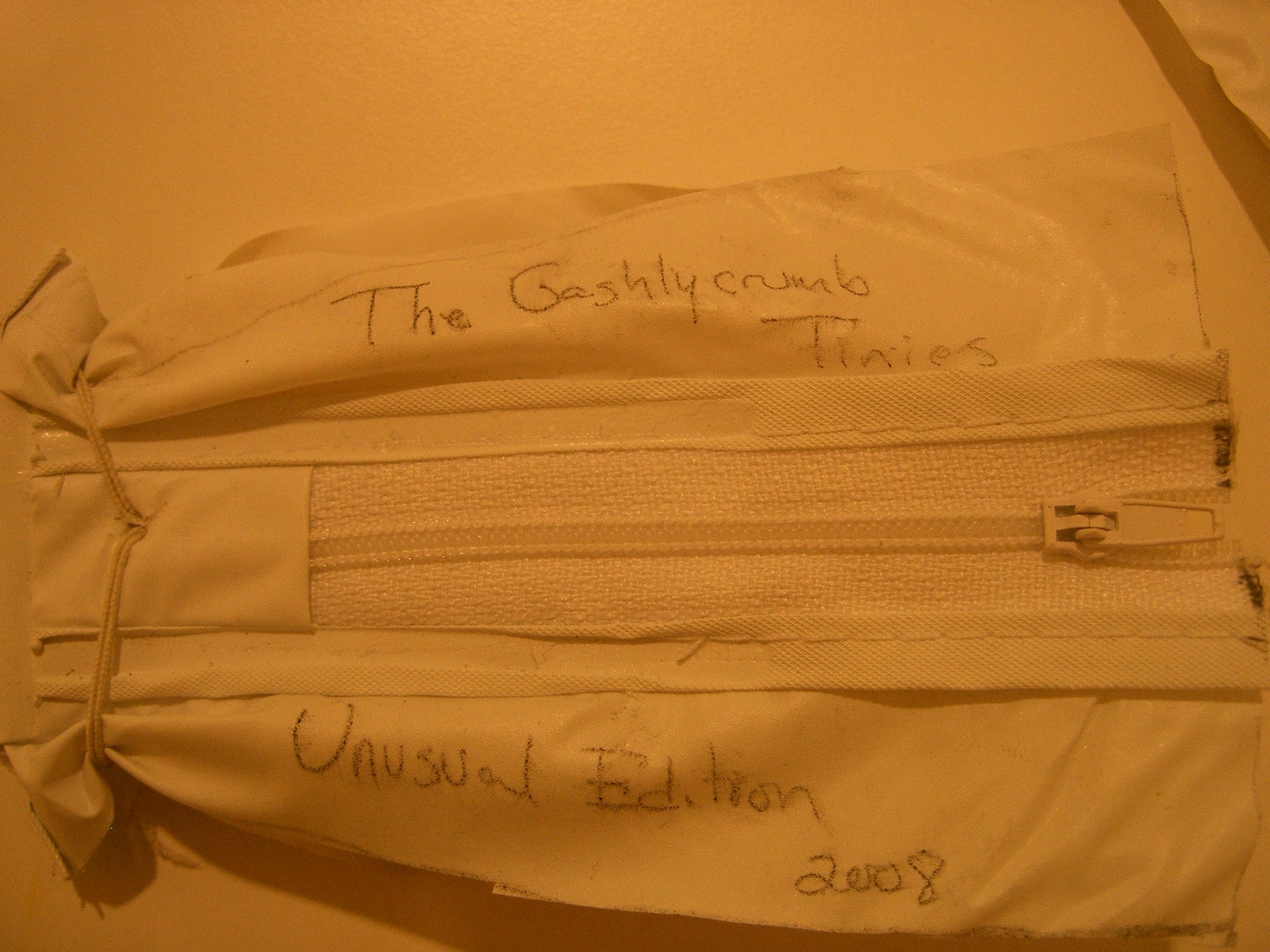 I then began reciting The Gashlycrumb Tinies to myself, as I am going to paint all of the lines from the book on my kitchen walls. At the same time I was wondering what I was going to do with all the toe tags that I have. Then it clicked! I could make a book out of toe tags, using a defective body bag as the cover.