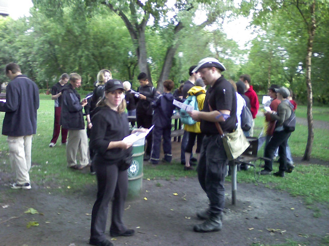 We made it to Nicollet and got on the bus without further trouble. But about half way to the stop near Loring we spotted the red-haired chaser on the Mall. We tried to make the bus drive past him through sheer force of will, but no luck. The bus stopped and he got on. The five of us tried our best to hide our ribbons while the Chaser sat directly in front of Notbatman, facing sideways and surveying the crowd. Notbatman kept it together for a while, but he eventually cracked a smile and told him "That was my poker face". He looked us over, said something to the effect that a Chaser would be really happy to meet us when we got off. Notbat said "We're not getting off. We're going to stay on this bus to the end". Luckily it didn't come to that. The Chaser made a phone call and got off near the stop we were hoping to take. We rode a couple stops past, got off, and backtracked our way to Loring. We approached the Checkpoint quietly from the south, walking into the park a bit to possibly use the trees for cover. When we spotted the Checkpoint itself we all broke into a jog which quickly became a full on sprint when some Catchers made themselves apparent. The Catchers were between us and the 4th Checkpoint but somehow we all managed to evade them and get to the safe area. Woot!
