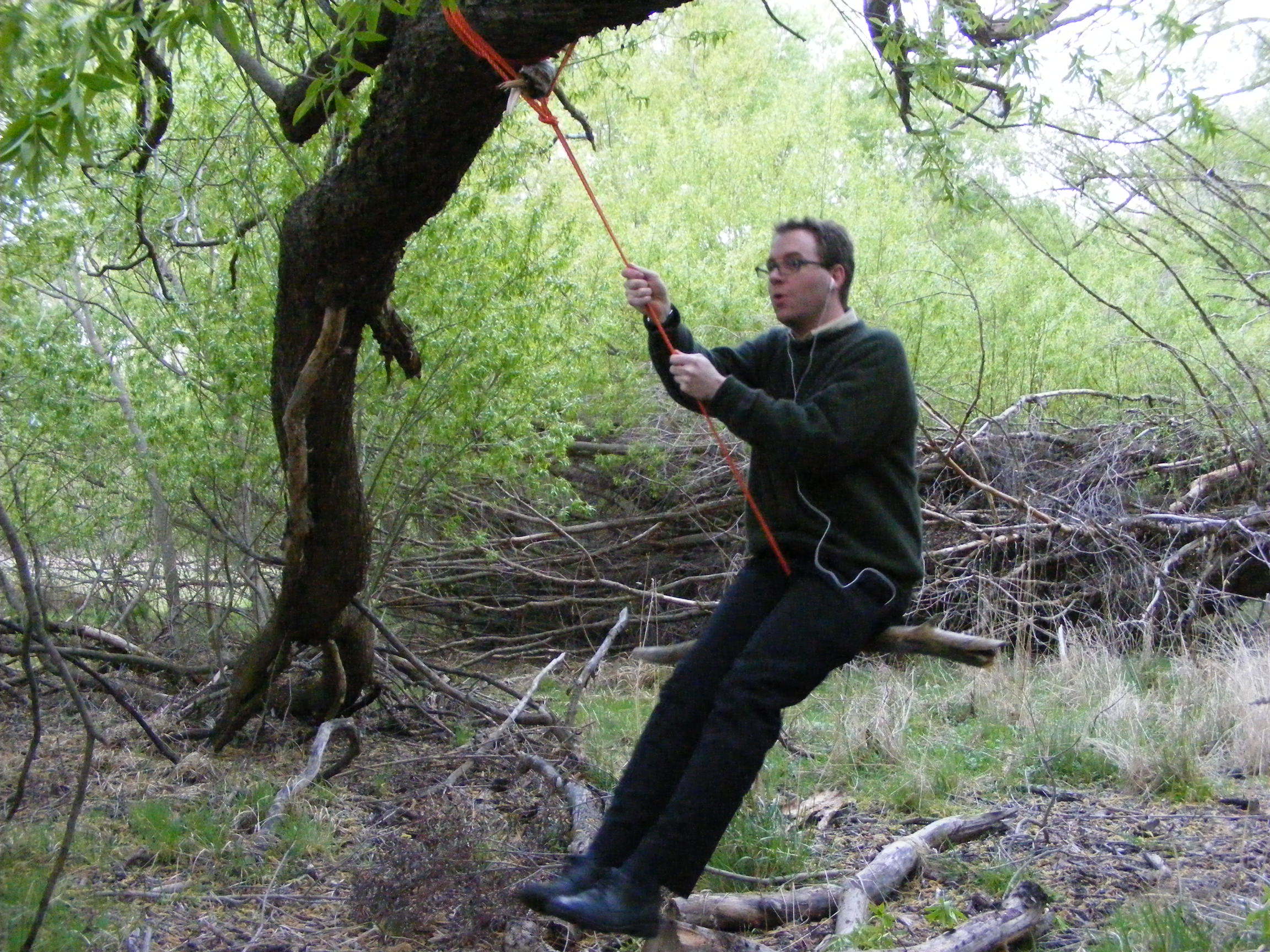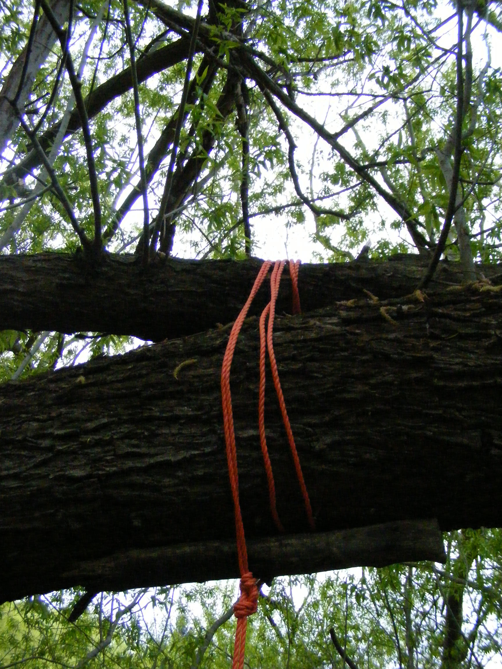 I had also thought carefully about swing design. The rope is doubled up, so that either strand can fray through and give way without effecting the ability of the other to hold the tree. Likewise, both ropes are tied to a second, higher, branch. This means that if / when one rope frays through, the other will be tied to AT LEAST one branch without slipping off. Finally, I added a branch at the bottom of the loop of rope. This means that the rope doesn't move on the tree so much. In future I would like to add cloth under the rope, further stopping this, but I forgot to bring it today...
