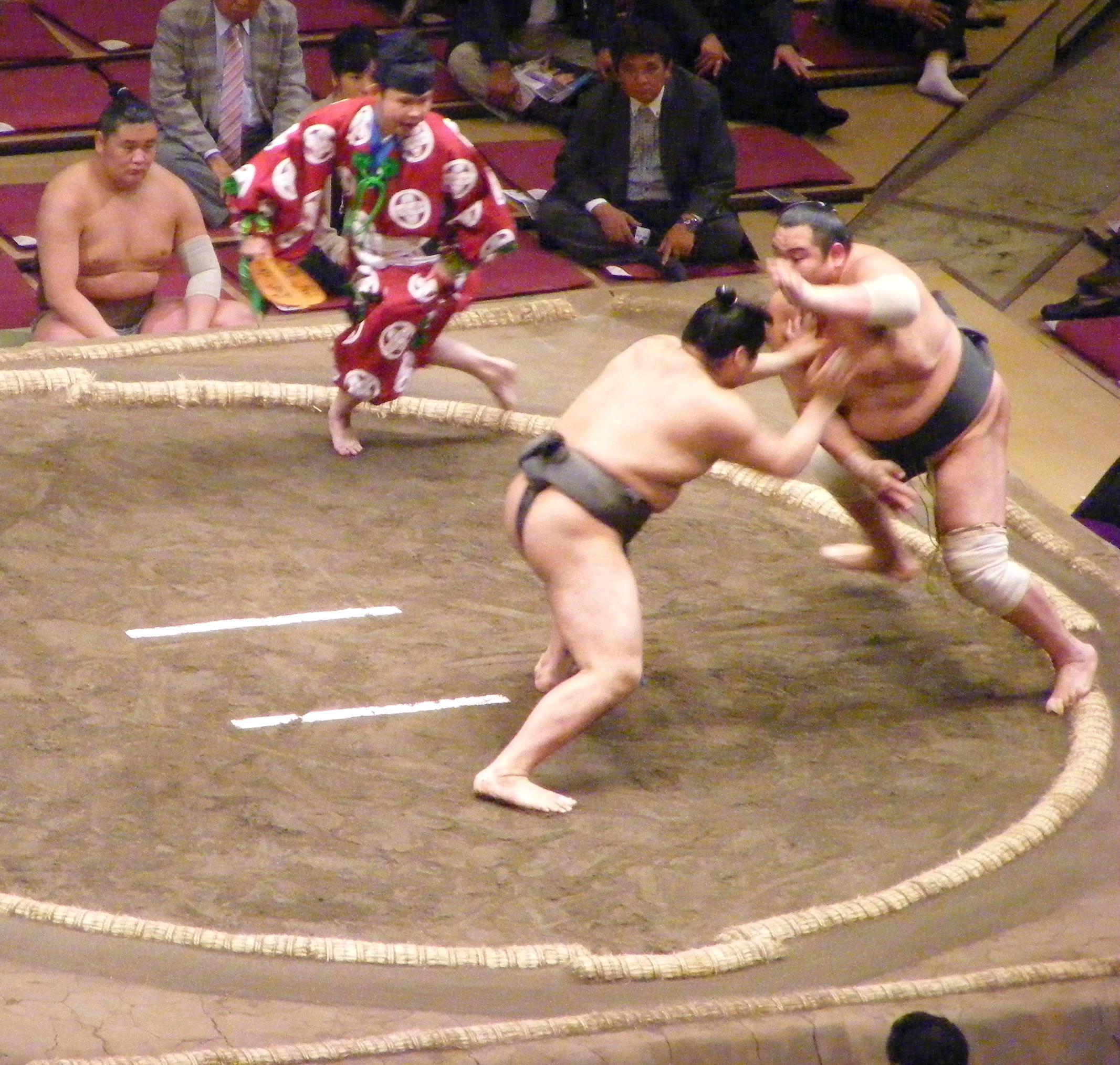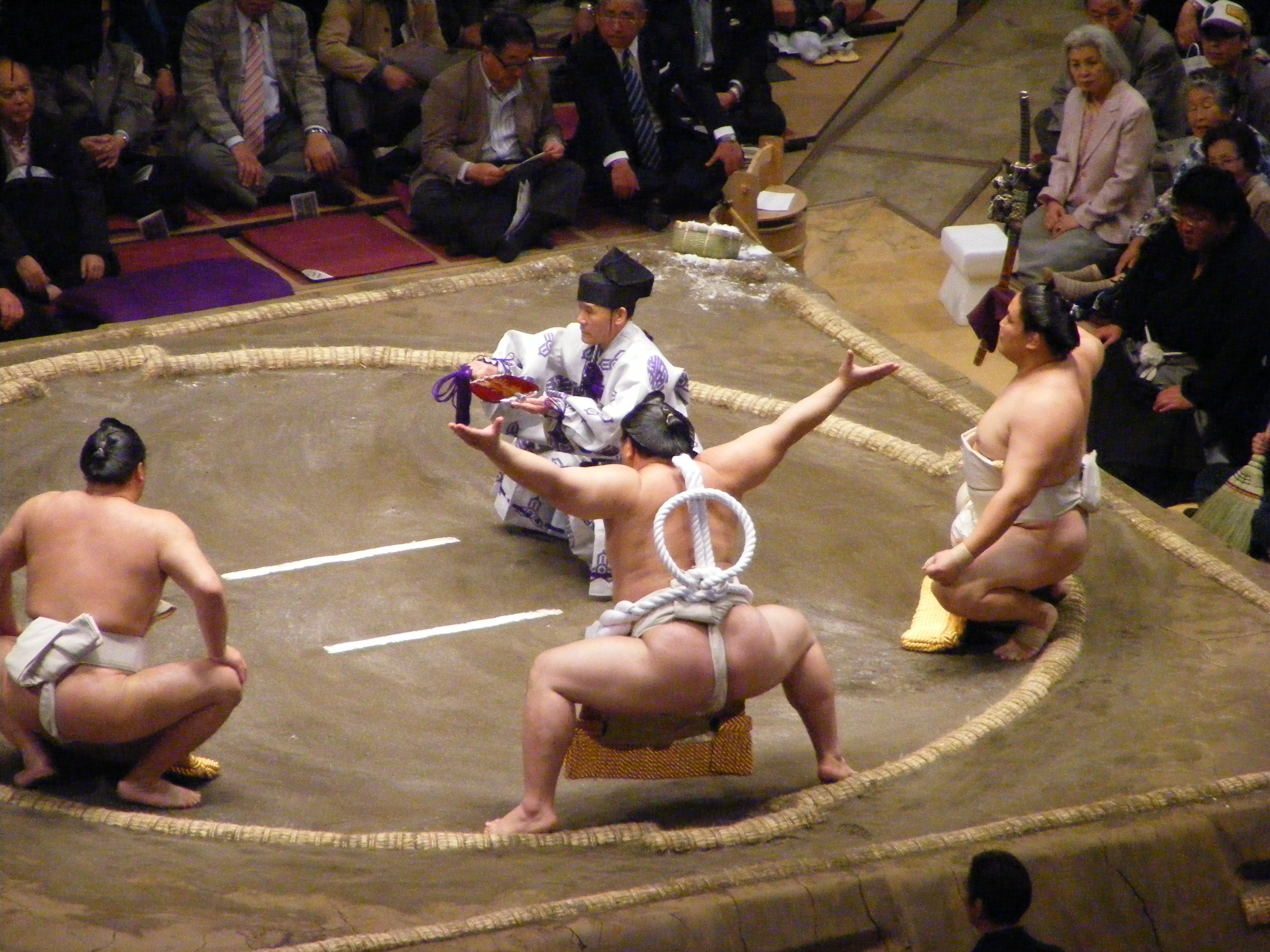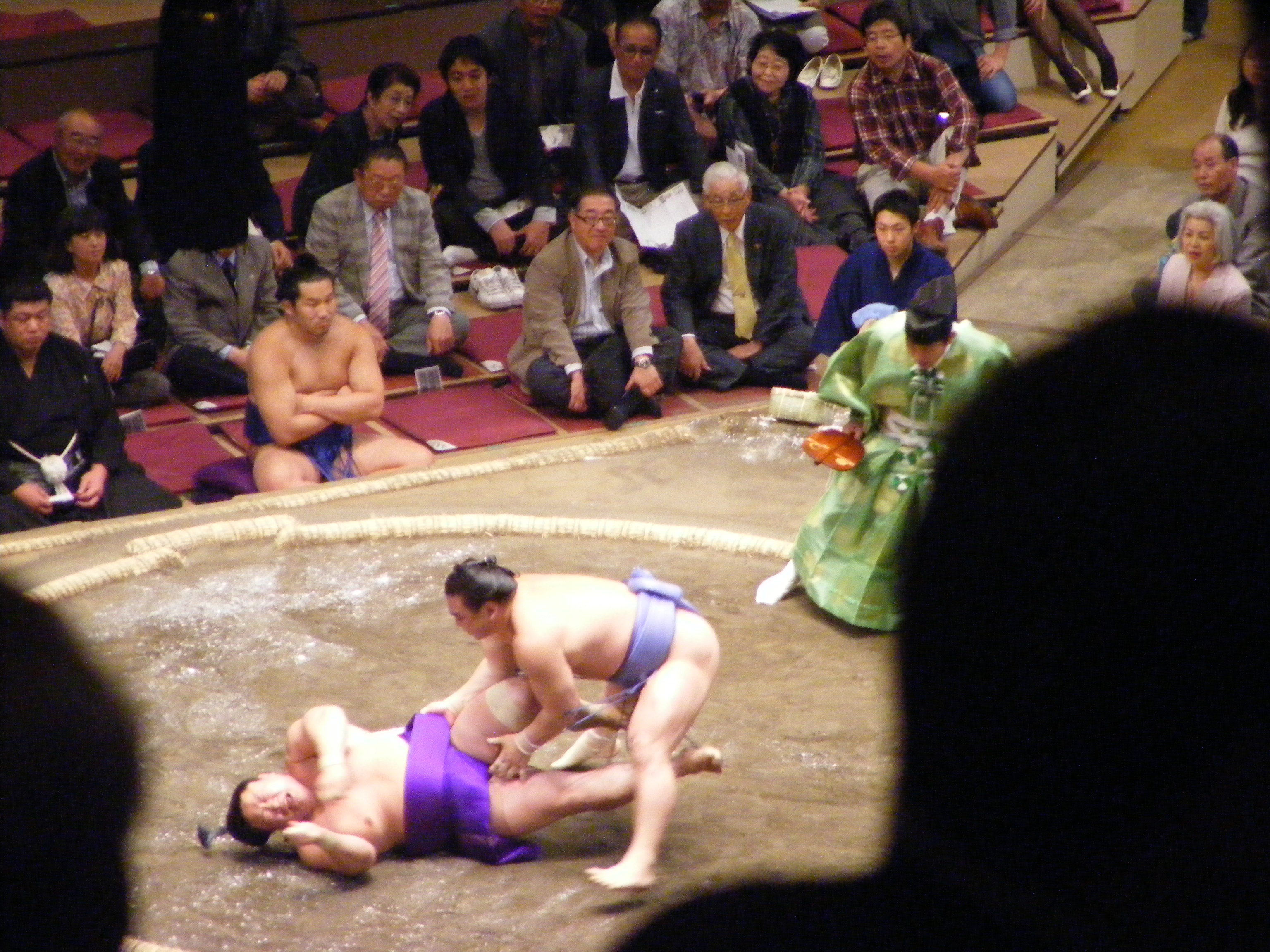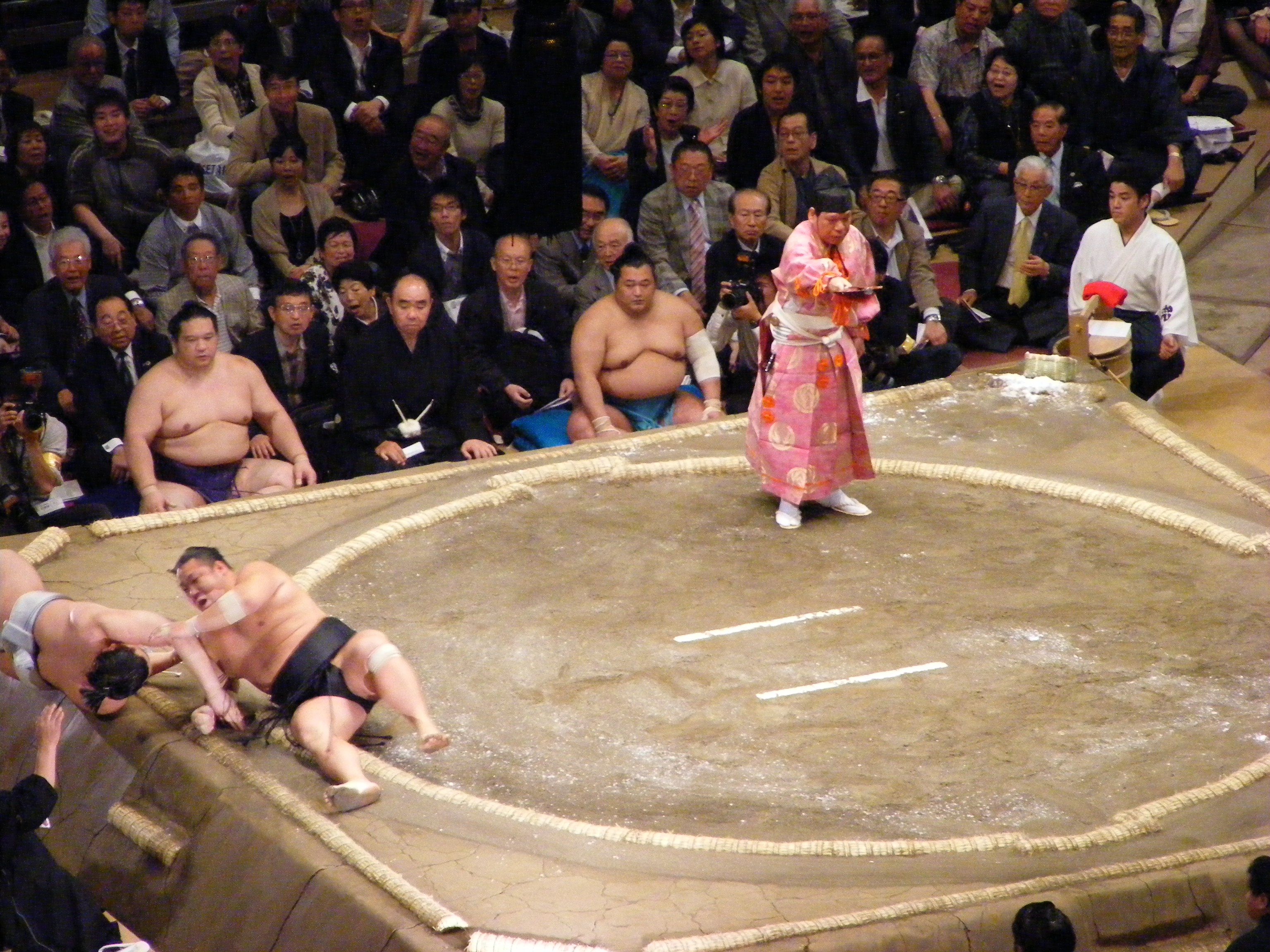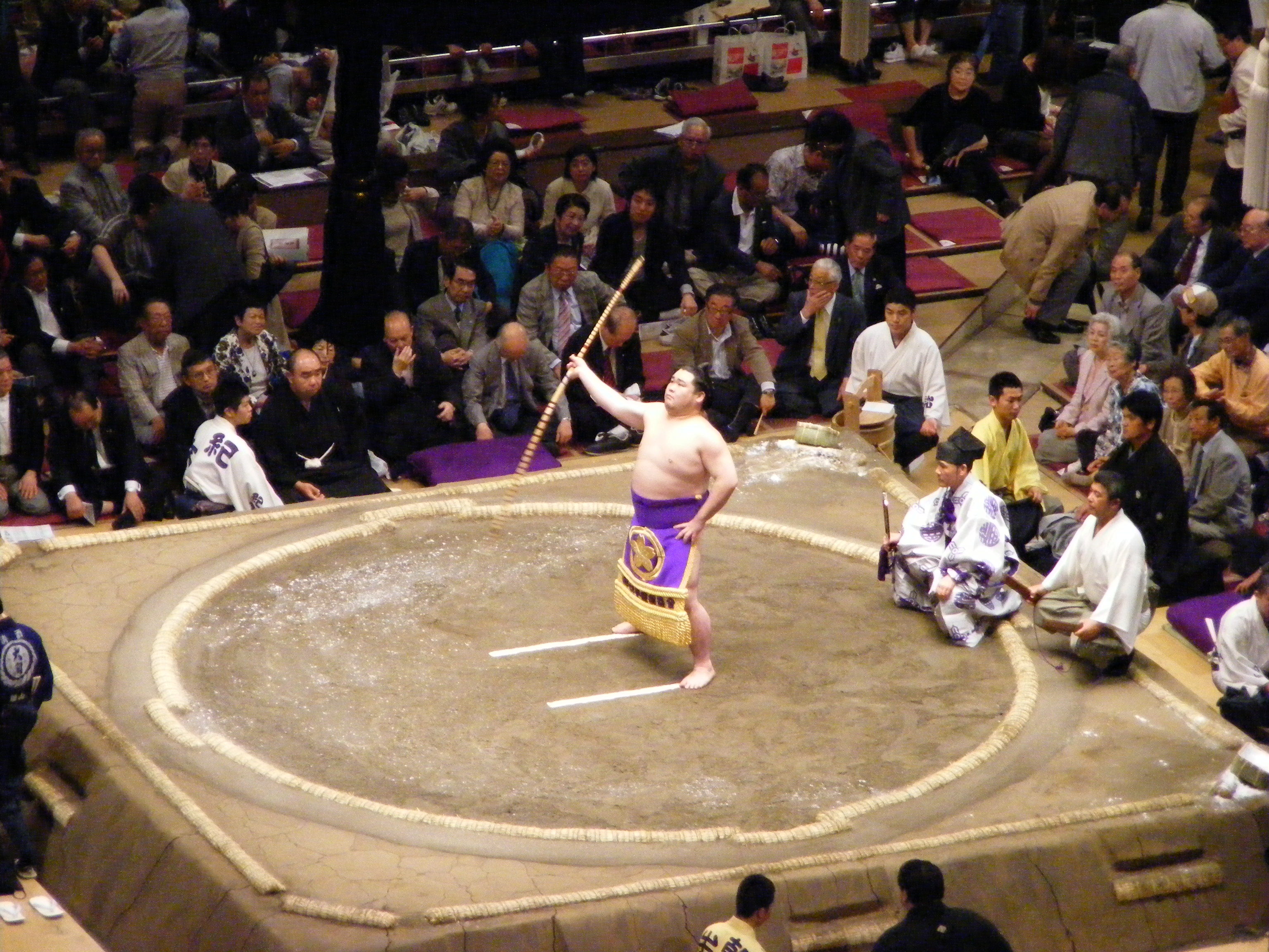 One of the sacred rites involved in the tournament. The final section of the day (for the top ranked wrestlers) is ceremoniously opened by the highest ranked wrestler from each direction. It's a sacred and moving sight - Also, do these pants make my arse look big? All kidding aside, it was another one of those things that should have been a bit ho, hum, and yet was deeply moving instead...