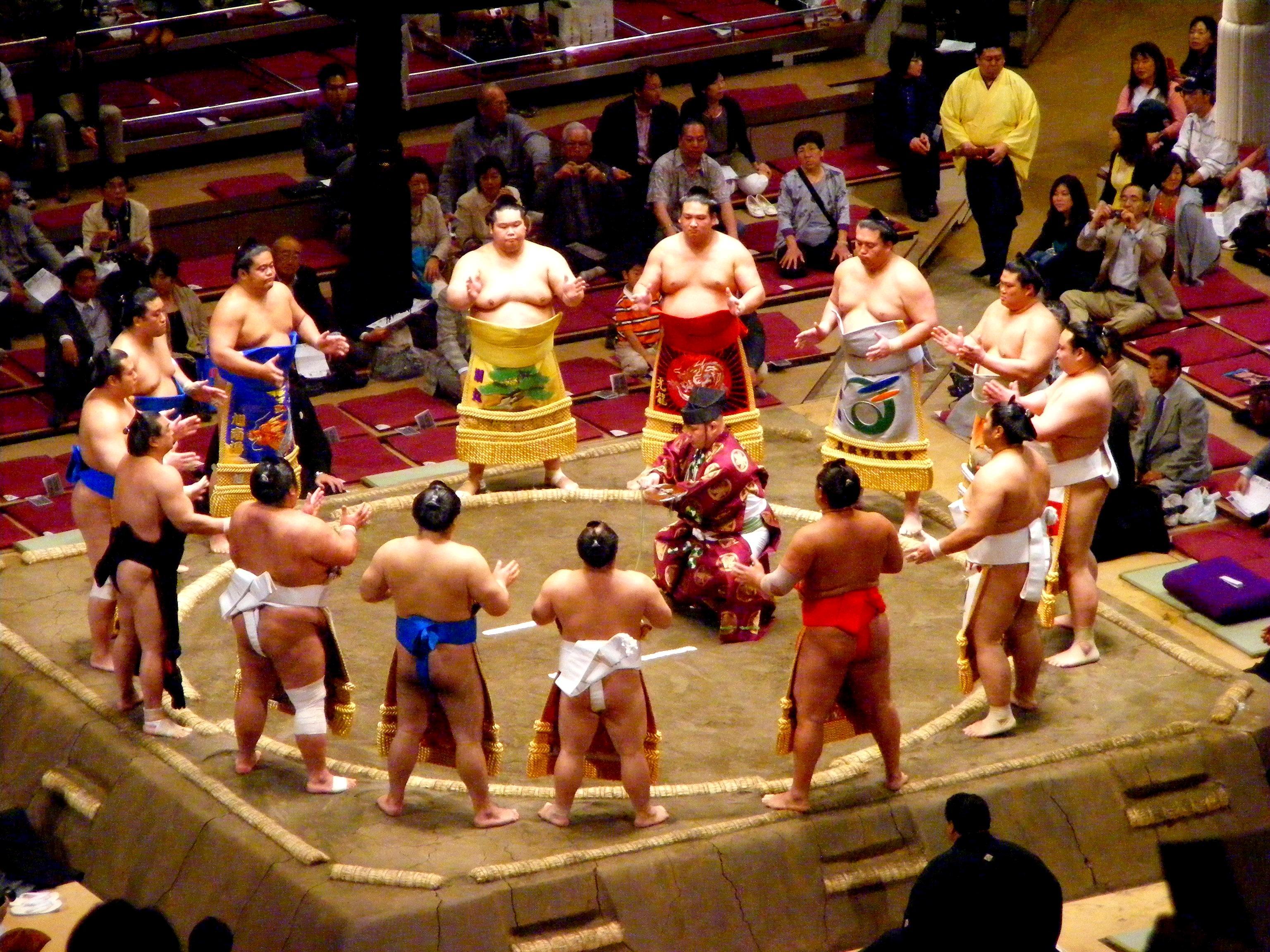 The closing ceremony, whereby one of the wrestlers twirls around a bow in various proscribed forms (one of the things most people don't realise is that samurai were originally horse archers, and the bow is still VERY much part of various ceremonies).