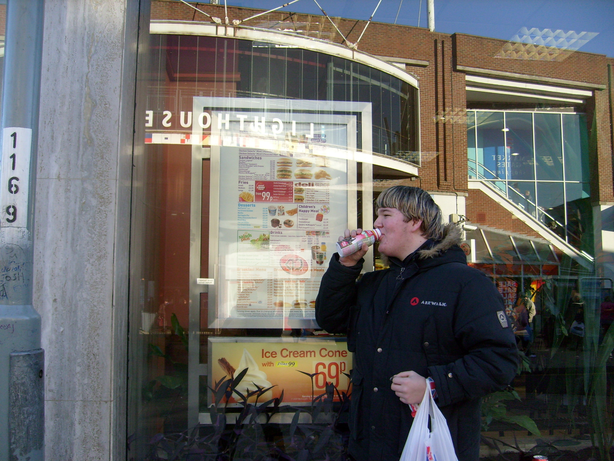 Ben and I begun the day with a quick wander through Market Gate and down to the Market Place. Sadly the light in the shopping centre was a bit lacklustre and my camera seems to slow the shutter speed whenever we are even slightly dark. We went out into the market where the sunlight shone, it was a beautiful, blue skied day and I had the list of photos written down in my Moleskine. We both got our cameras out and discussed how much we looked like tourists and began snapping away at mirrors, stalls, streets, buildings and went on a path around the town. We finished pretty quickly so we then retreated back to the café, had some lunch, and went back out to try and boost our portfolio, some people Ben knew for a portrait, a rather sad looking Xmas tree and some broccoli. Afterwards we all met up with the others and well .. the leash scene ensued.