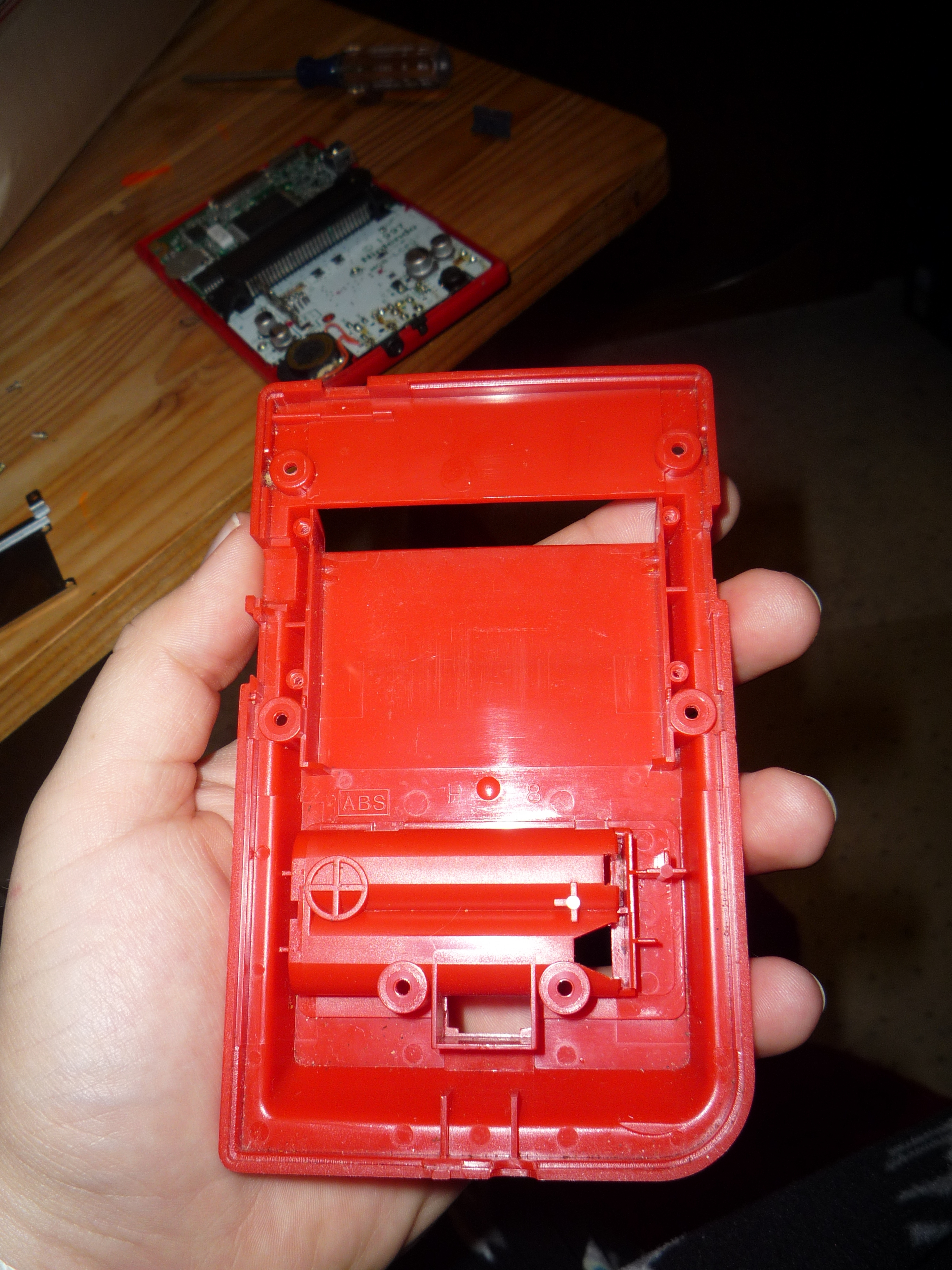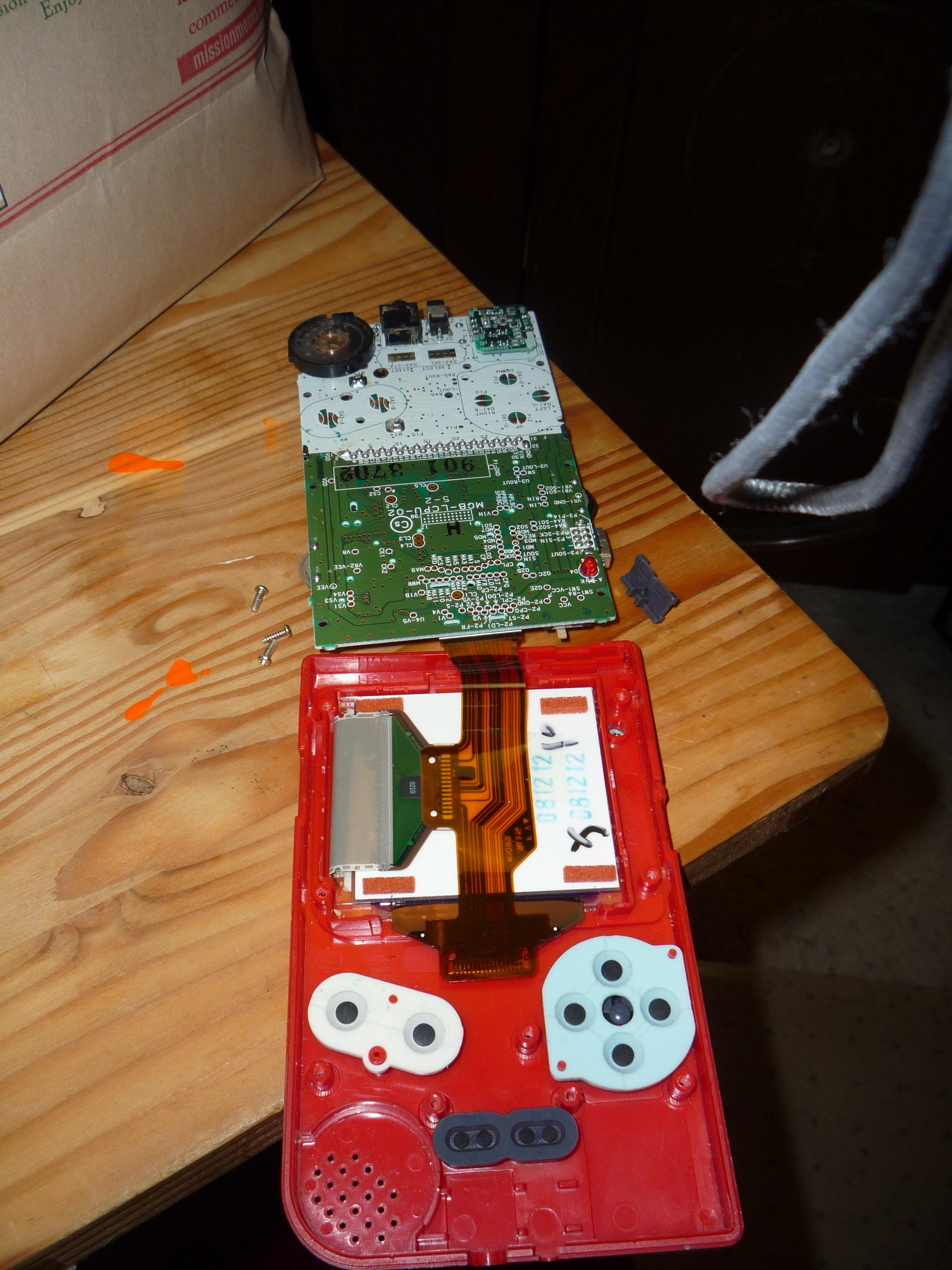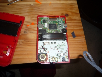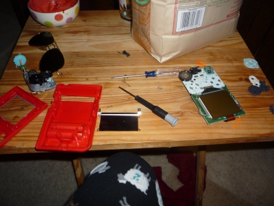 First off, I took the Nintendo apart. (Which was incredibly hard! It had seven three-pronged screws!) Half an hour later, this is what it looked like.