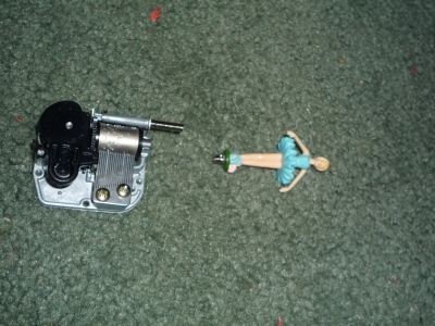 The problem was, once the music box was fitted inside the case, there wasn't enough of Prima's spring to fit her outside. So, temporarily, she was de-throned. I went to go look for hot glue.