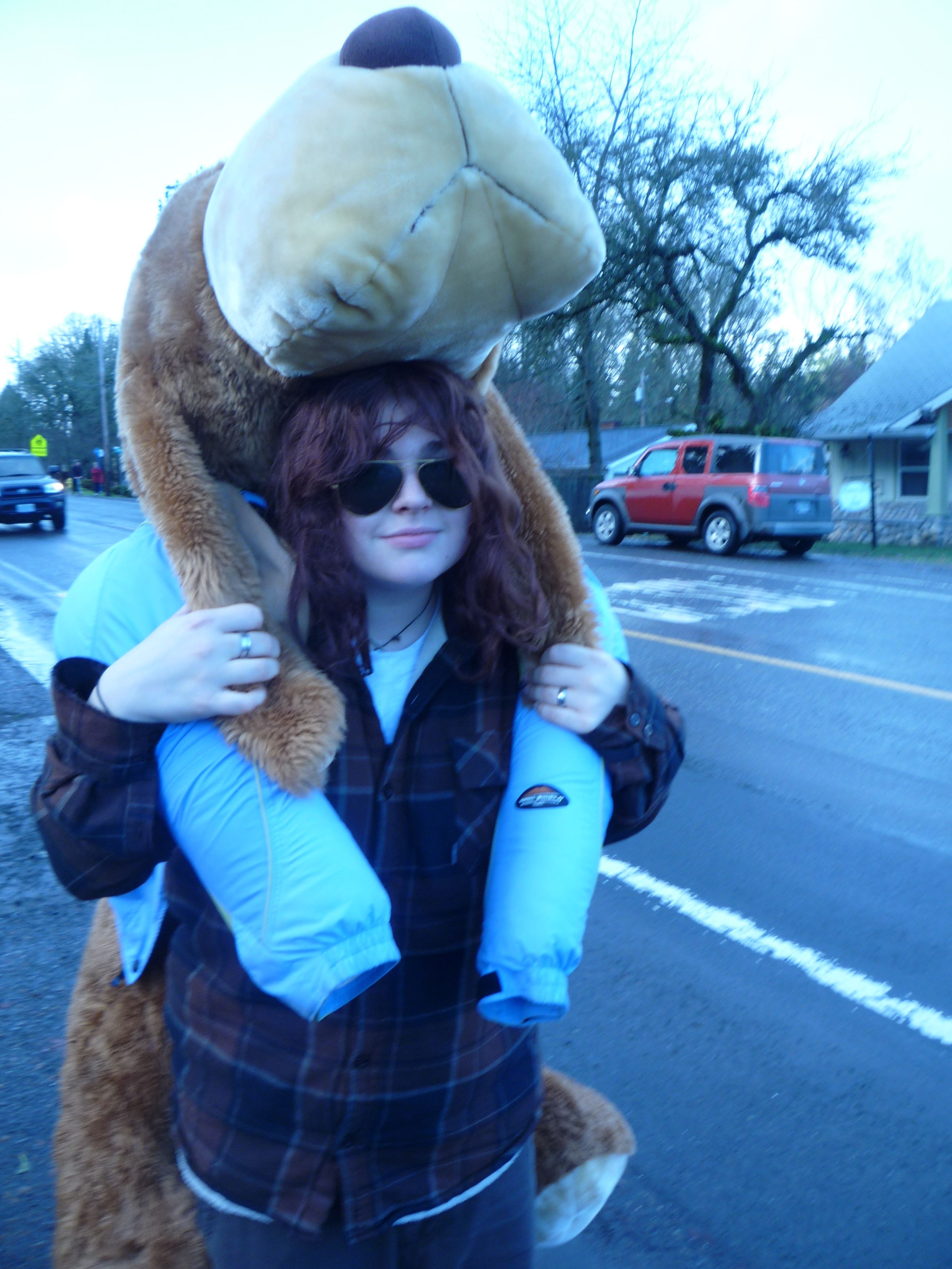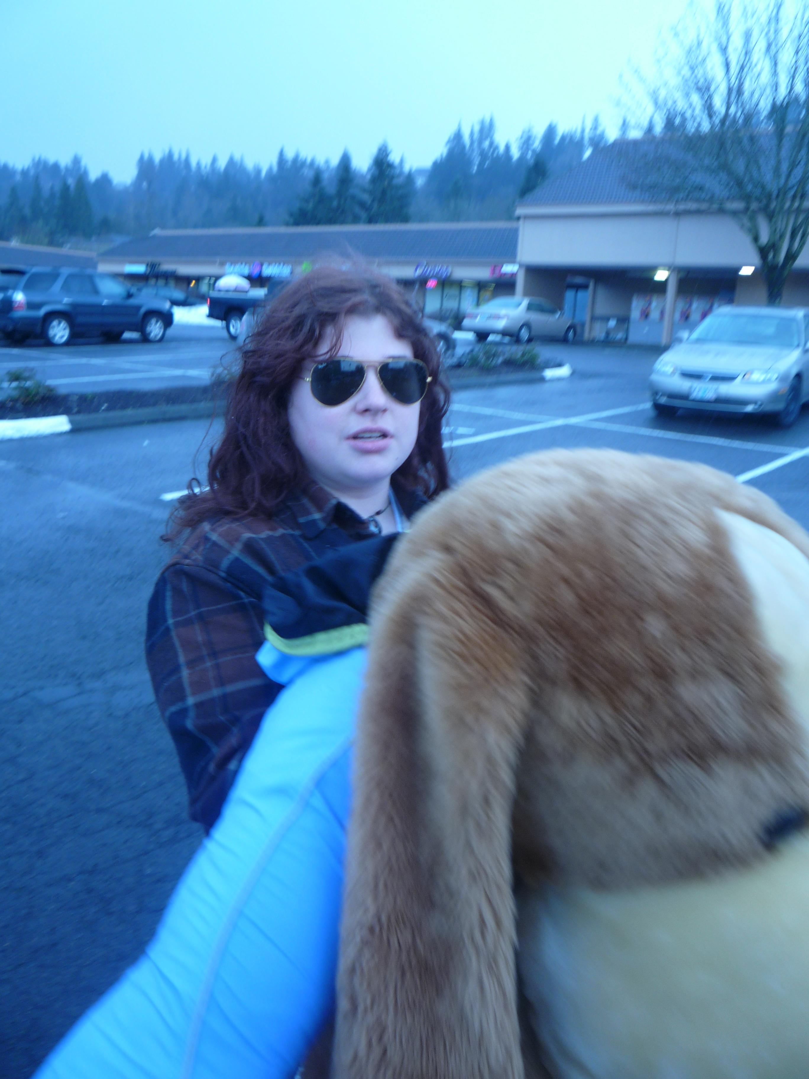 It was a bit more difficult than I expected. The memory in the camera filled up at this point, so while TBLT fixed it (thank you for that, again) the best thing happened. The little girl (her mom was on a cell phone and not paying attention) walked up to me and asked me what his name was. I told her it was Mr. Woofums, and she asked me if she could pet him. I said of course. She started to rub his nose a little bit, but then her mom got off the phone and yelled for her to come back. So, she left. Actual conversation they had: "Mommy, that girl has a big doggie!" "Yes, dear, but leave them alone." "Why? He's really soft!" "I don't want you to get kidnapped, honey, and that's how they catch little girls like you. With big, soft stuffed animals." I was shocked! What kind of garbage are they feeding kids these days? TBLT laughed a little bit. I wanted to say something to Momzilla, but it was our stop.