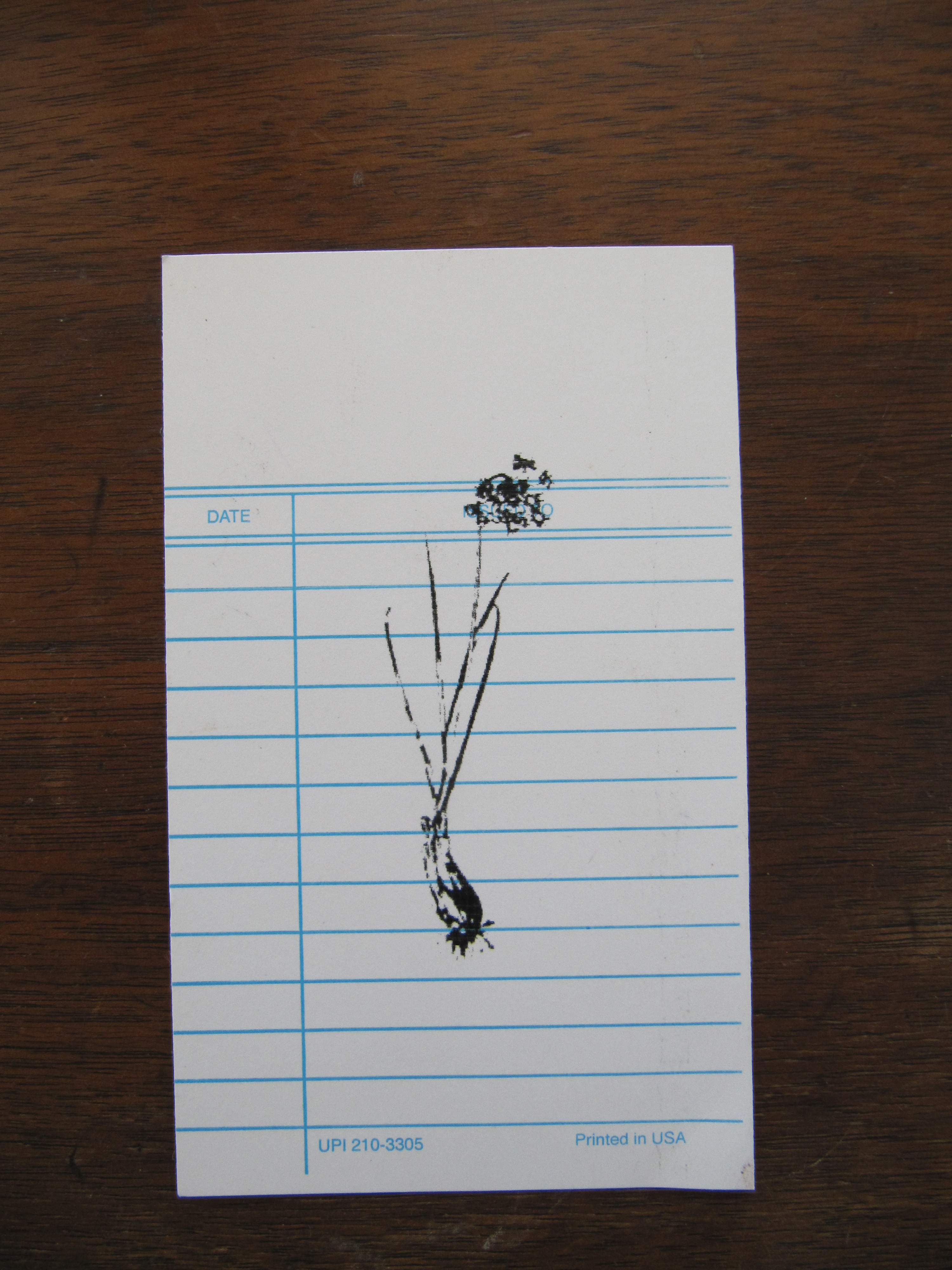 A little more orderly: chopped into the appropriate shapes, these check-out cards become fortunes. Each is a simple summary / impression of the book being returned.