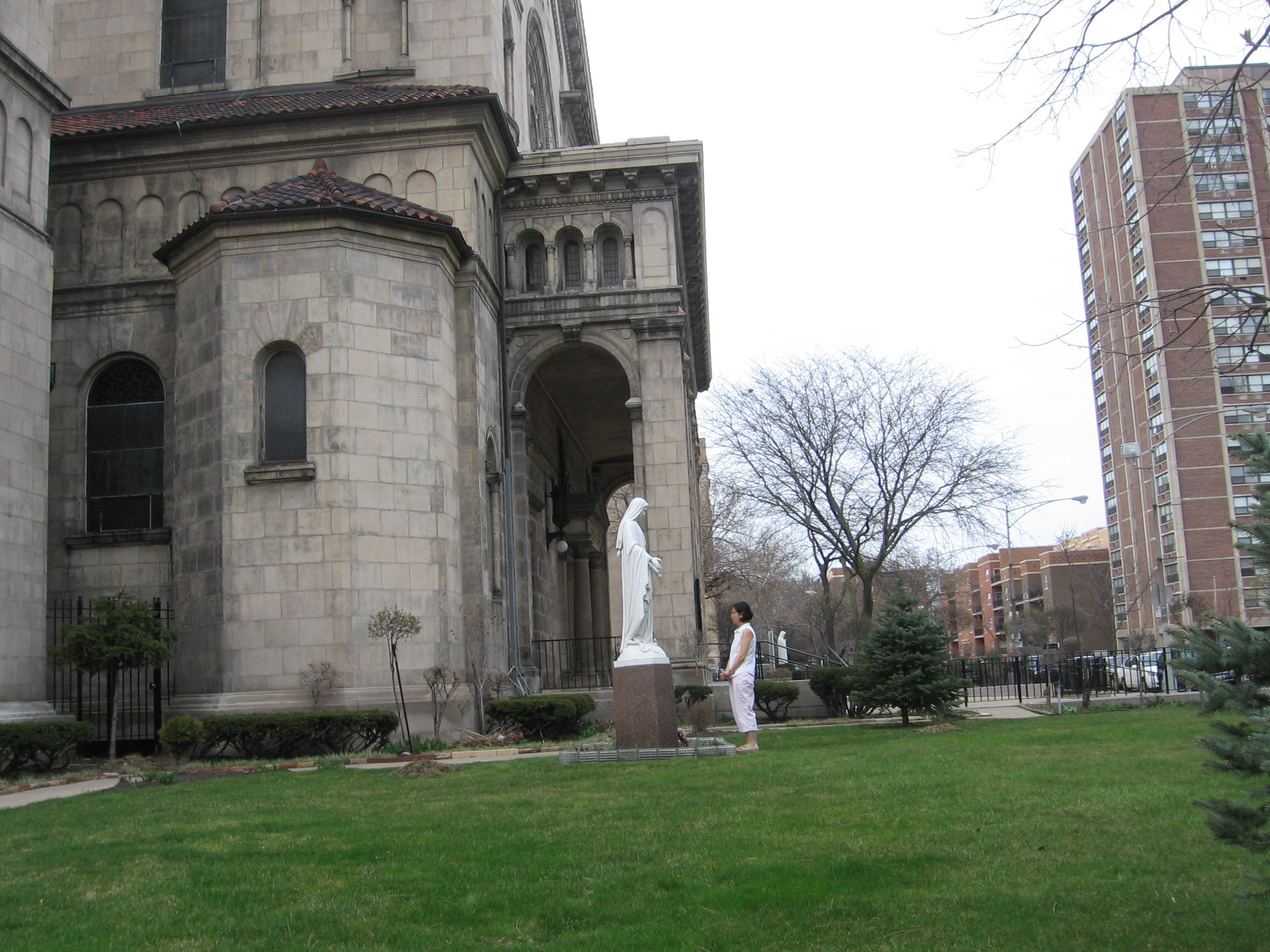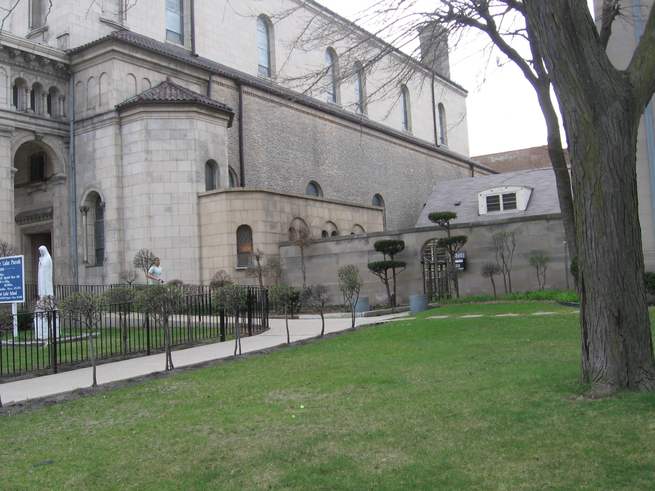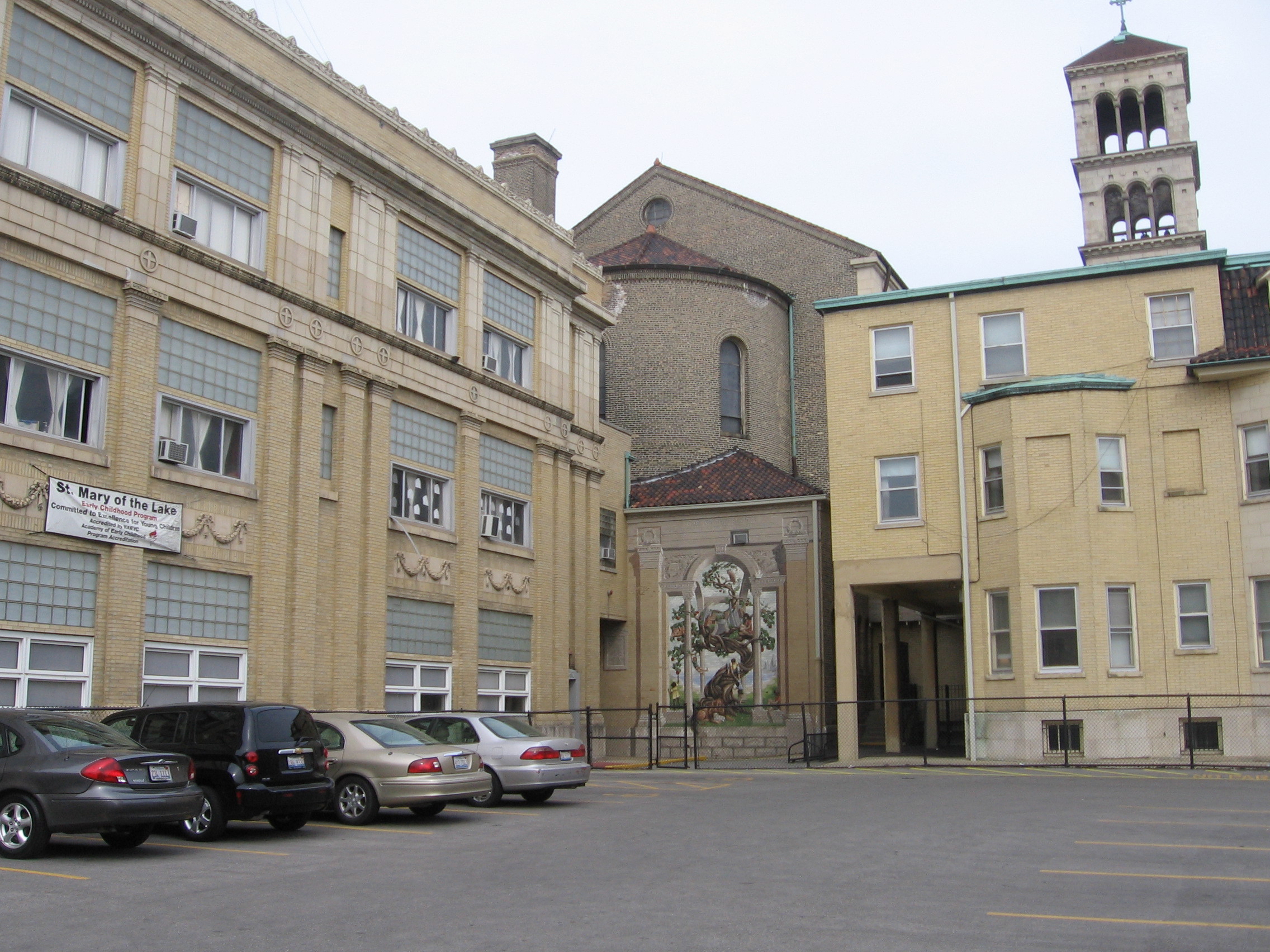 [The lakeshore had used to extend as far west as Sheridan Road, and this state of affairs is what the latter half of the parish name refers to; on the map above, the blue line denotes the most westernly point of the lakeshore past, the red placemark is the location of St. Mary's. How civil engineers managed to push the lake east half a mile, I've yet to discover.]
