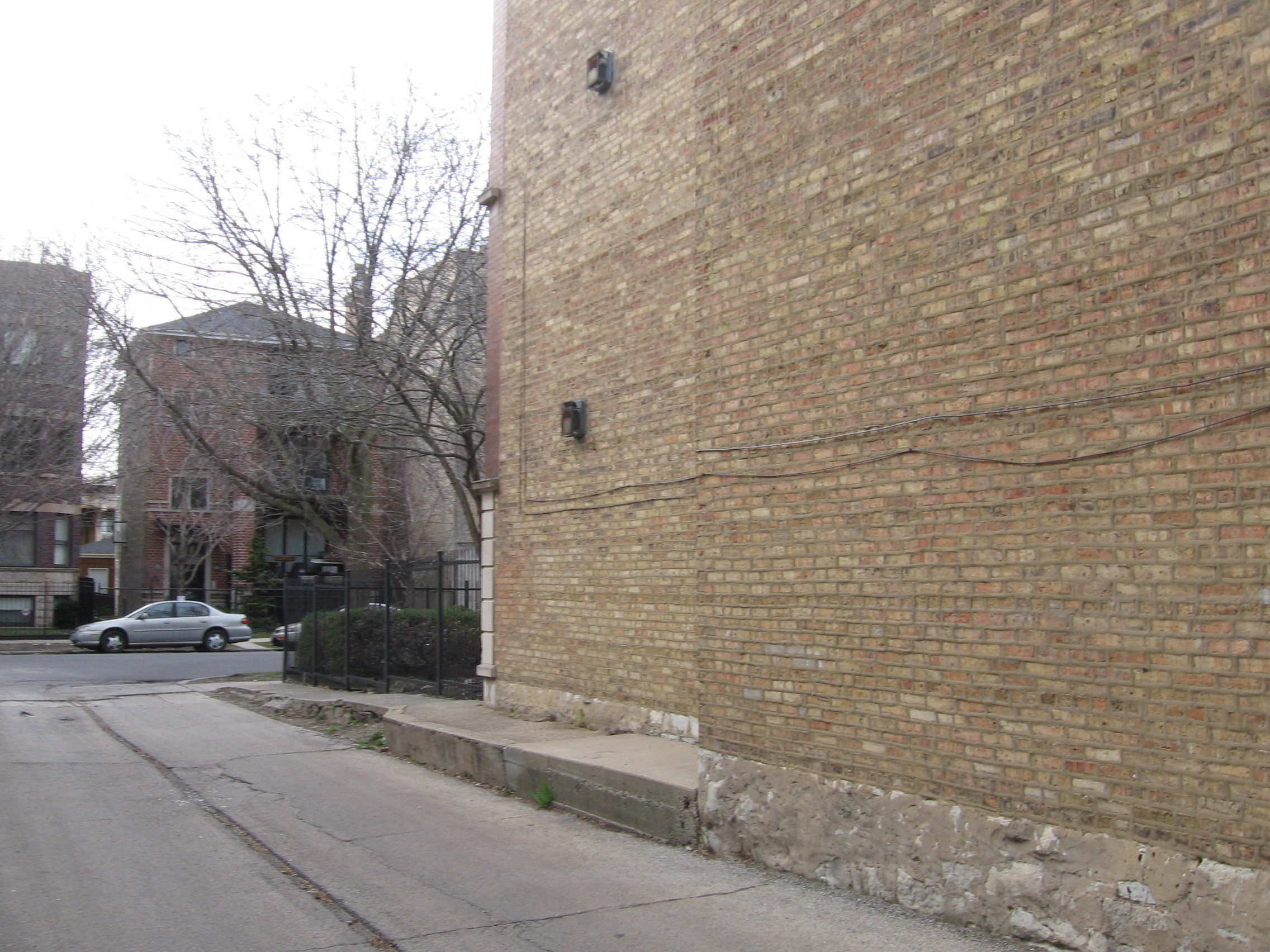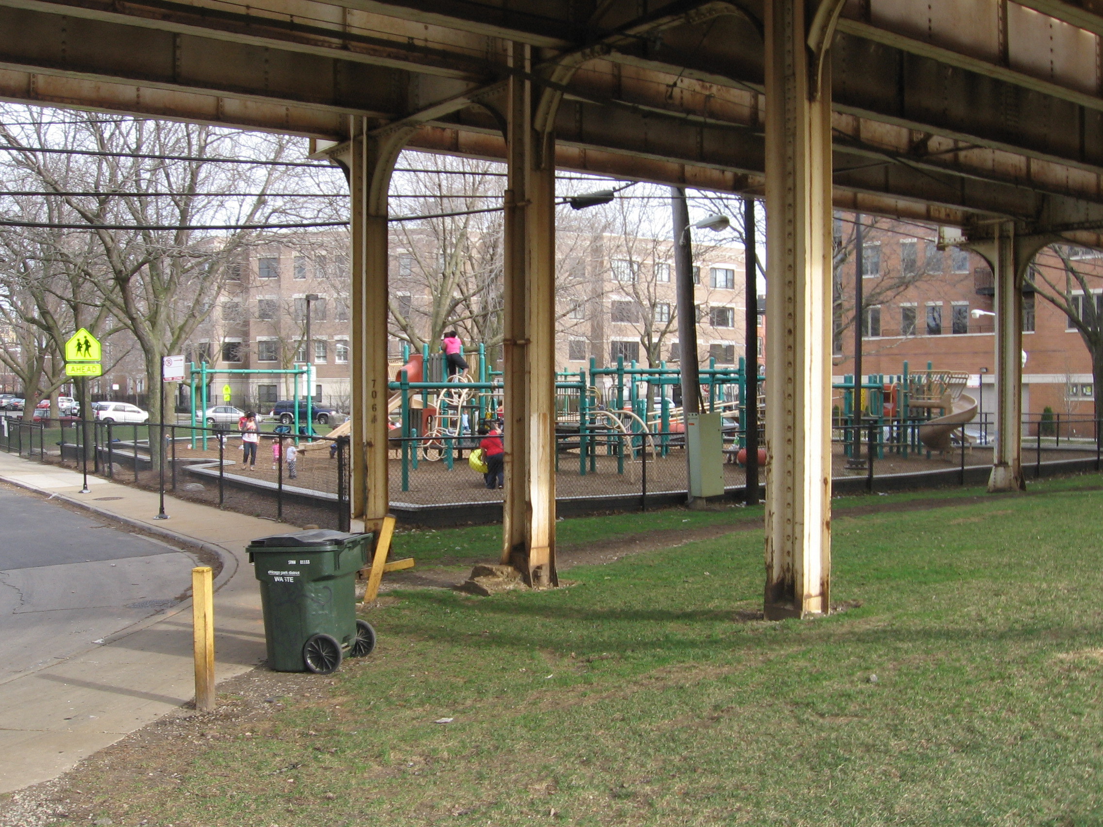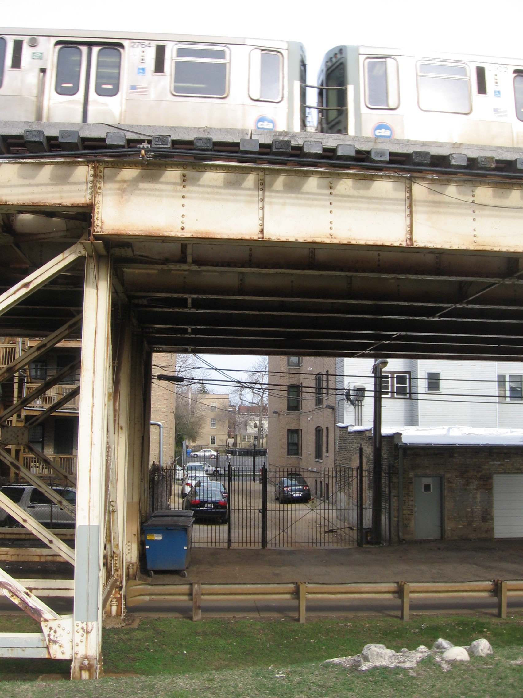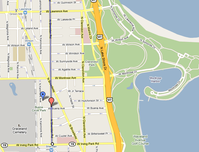 From east of Kenmore to just past the alley-passage on the west which runs directly beneath the tracks; heading south, we have come to a small walking park up the side of a manufactured hill between the Red Line L platform and the barriers which fence the public out of Graceland cemetery.