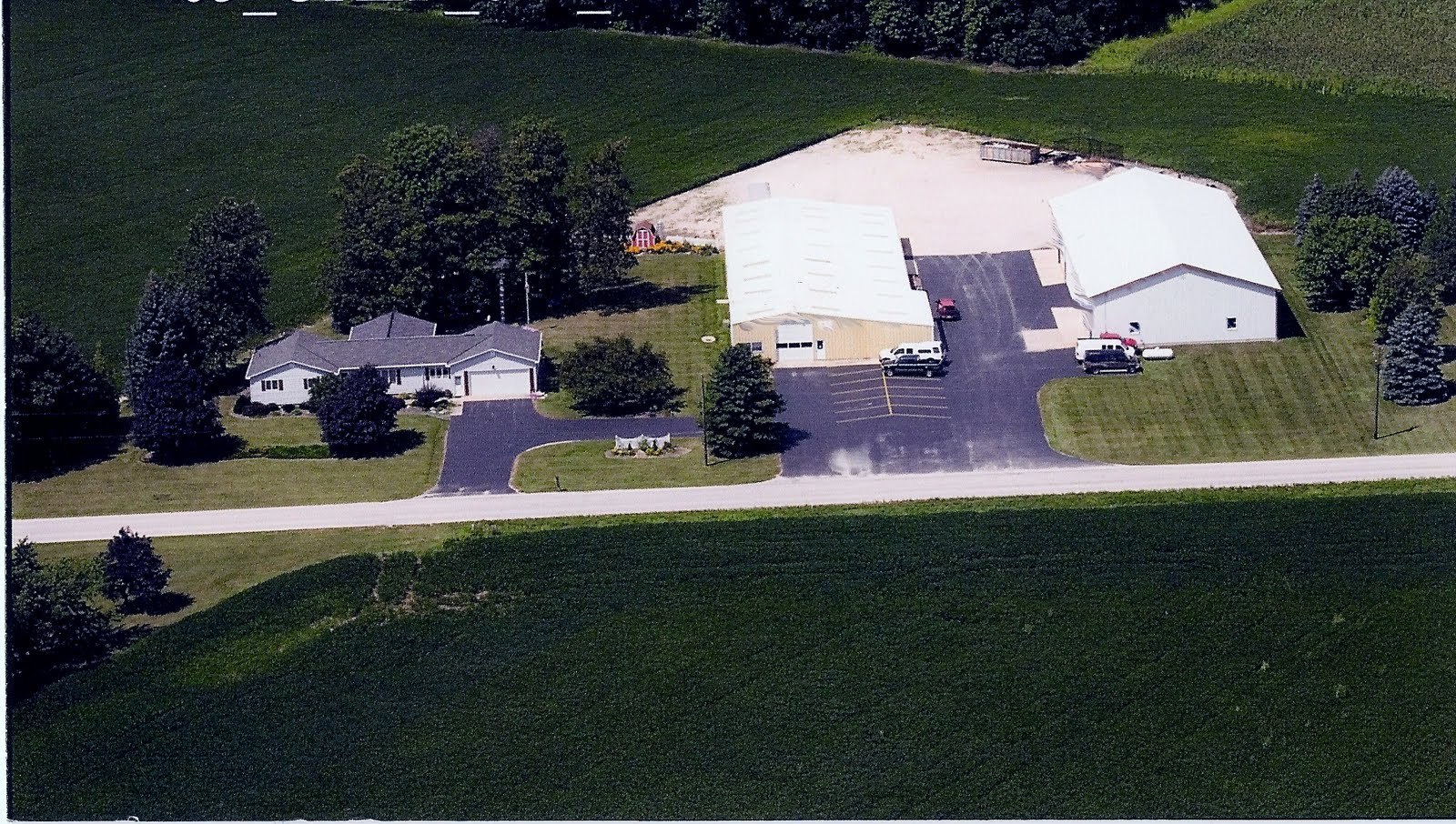 In the breezeway of my grandparents' house, there are a series of these works, several of which were added during the course of my chlidhood,—the rectangular and squarish outlines of the little house and the polebarns' rooftops there interrupting the green checkerboards of the surrounding fields, the sets of crops made even more orderly from above—the property and the house always recognizable, though rendered slightly foreign by angle and era. In the little alterations from one picture to the next, in the sidings of the barns, the expansion of the house, the institution of proper driveways and the disappearance of the fenced-in pasture of when there were horses there, in these differences time wrapped around the room, canvas by canvas, and I would always try to find all the changes from one to the next. And I would visualize where I was in each picture, straining my hazy eyes at an image made decades before my birth of a house that I was standing in right then.