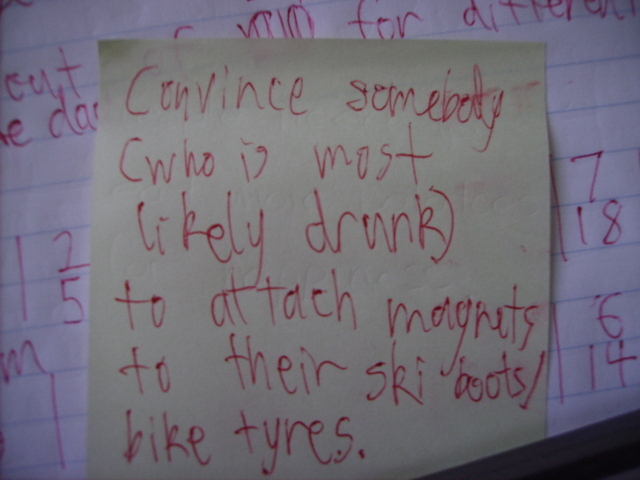 "Convince somebody (who is most likely drunk) to attach magnets to their ski boots / bike tyres." We thought of this because we wondered what would happen if somebody had magnetised ski boots the stuck onto the skis. Then we realised that they might get stuck to the chairlifts and the tows. Then we realised this would be absolutely hilarious.