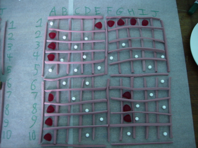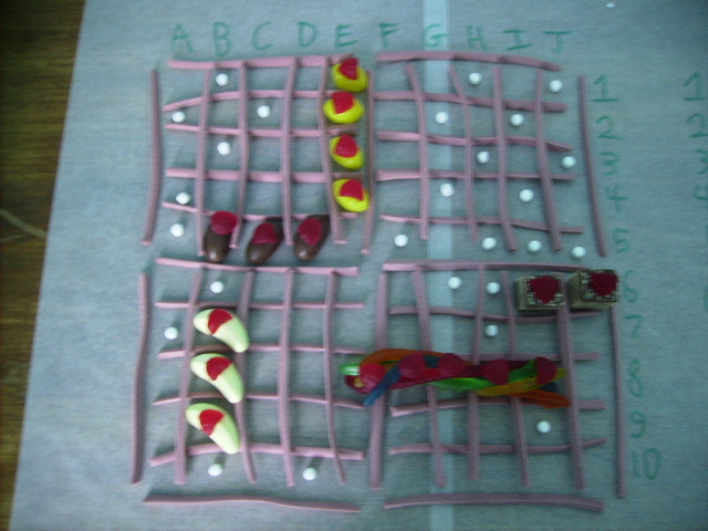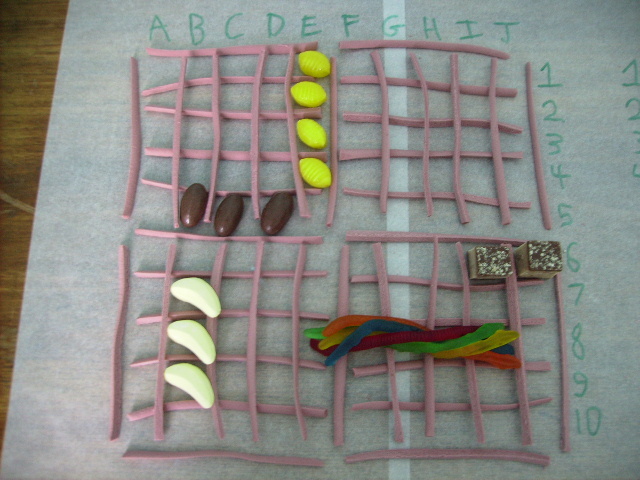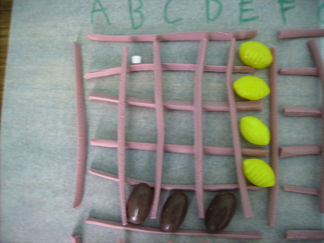 I set up two grids using the Big Bosses, on greaseproof paper. I wrote co-ordinates on the paper to make it easy to navigate. One was to place my boats on. The other was to mark my guesses on. I used small, cheap, white mints to mark the misses for both side and Lolly Raspberries to mark the hits. Here's the setup of my ships: