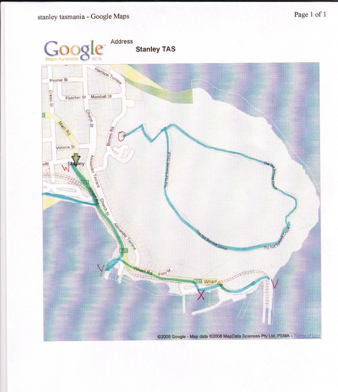 The first map in the series. In order the path to be followed goes: -The Wharf ruins (V) -The Wharf (X) -The Little Jetty (Y) -The MiniMart (W) The other blue line follow the walking track around the top of the Nut. (O)