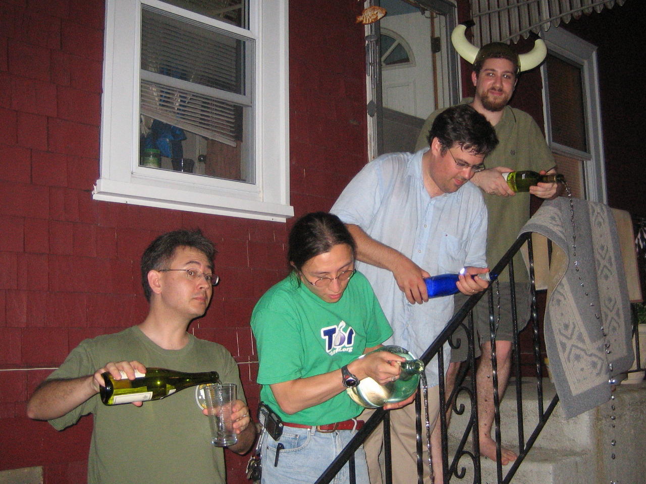 Though there were many fascinating anagrams for "nuclearpolymer", I went with "men clearly pour", recruiting Bunny Dragon and other male guests at a weekend dinner party to pose. I like the way that this photo captures the water globs cascading from the top pourer. When I asked Listener to caption this picture, he said "Men pouring badly"