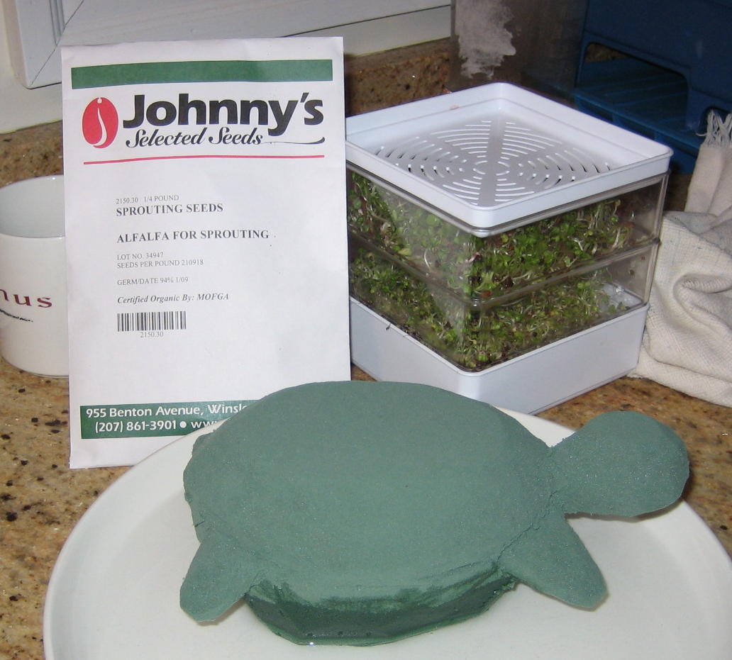 Backing up for a moment. I figured that florist foam would be a great substrate for making a pseudo topiary. It's easy to carve, holds a lot of water, and is slightly squishy so you can press seeds into it. And alfalfa sprouts are the canonical type of sprouts for eating. But alas, mold was the only thing really growing.