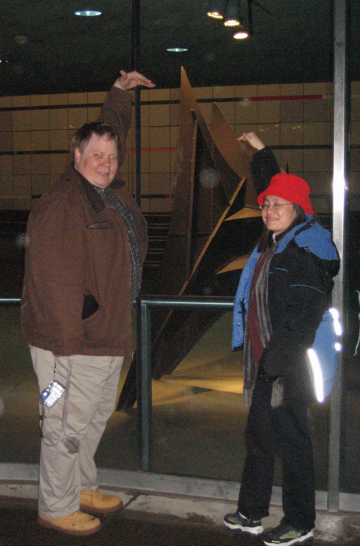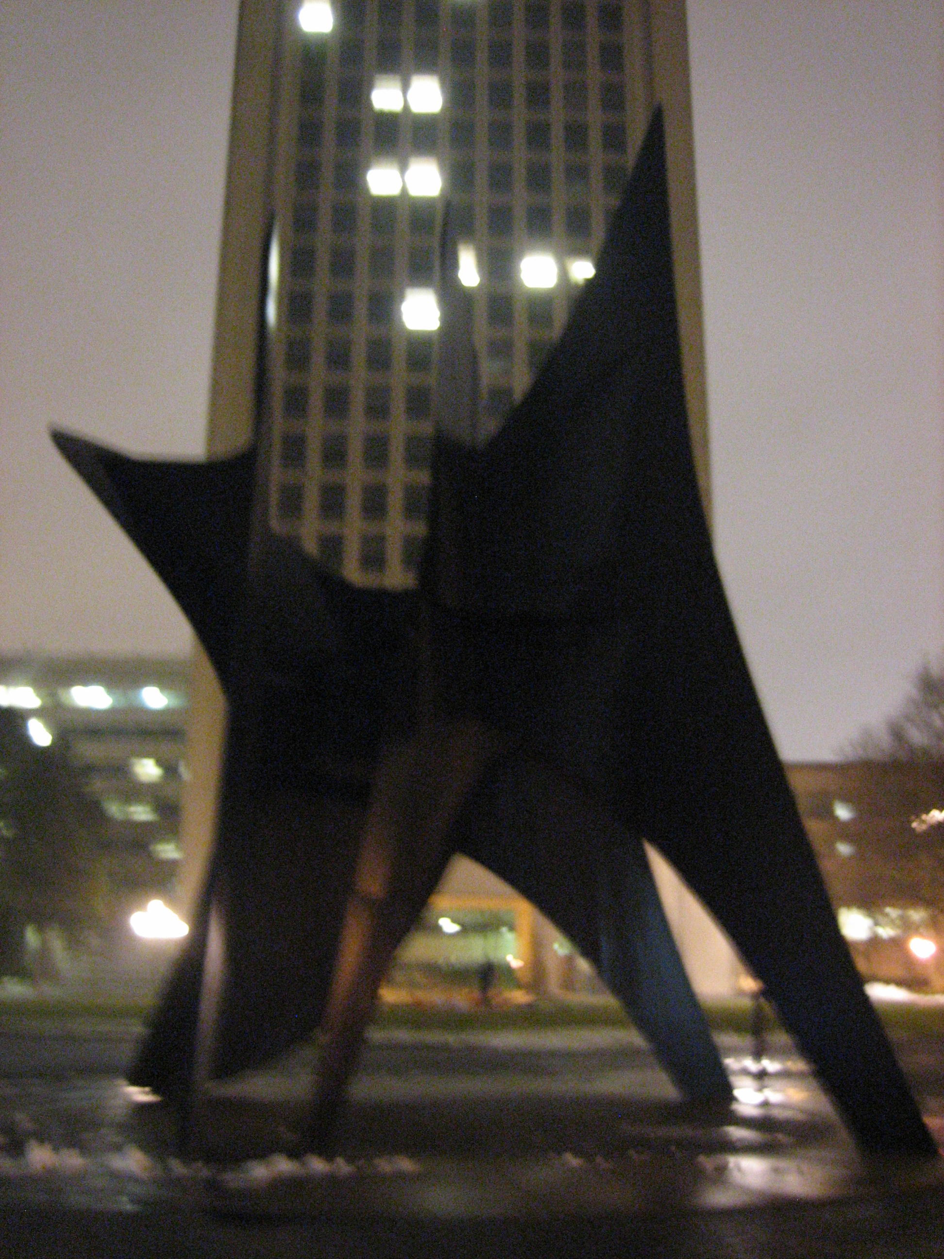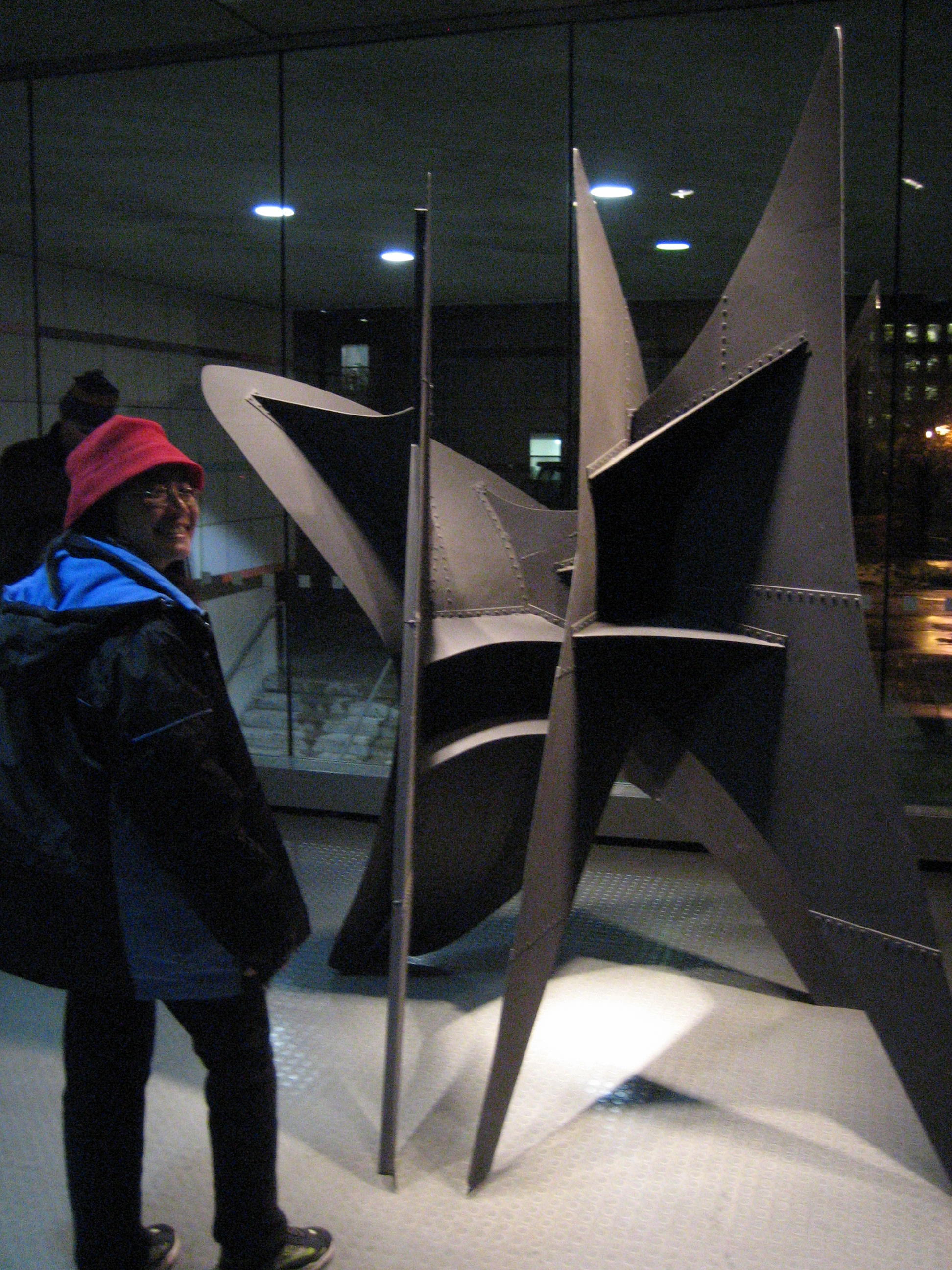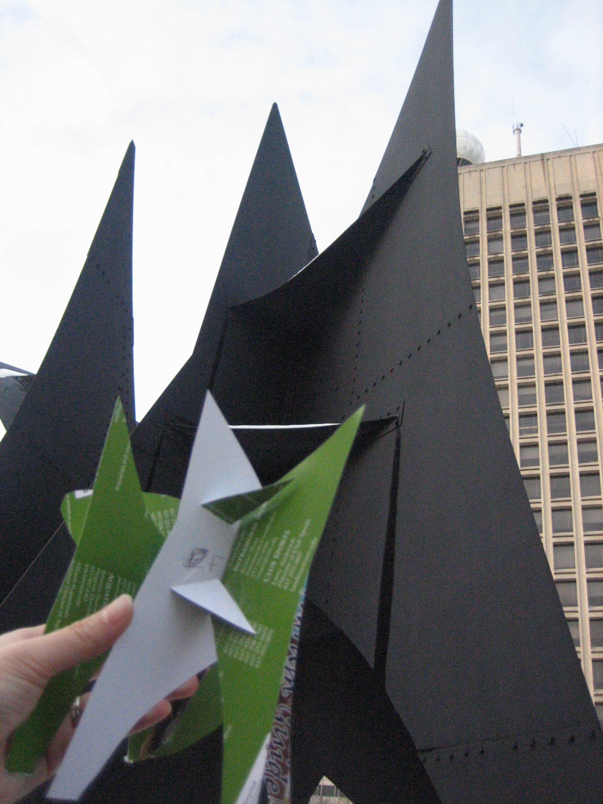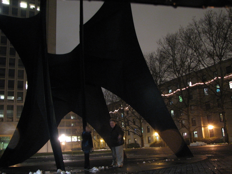 December 30th, 2007 5:53 PMOne (locally) famous work of art is Alexander Calder's "Big Sail" and "Little Sail" pair, which are at MIT. Locals call the larger sculpture, which stands 40 ft tall, the Great Sail. There is a story that it was commissioned to solve a little problem posed by the Green Building. This building, which is not actually green, is the tallest building in Cambridge because it has the maximum allowed number of floors (18) and stands on 2-story tall stilts. On extra breezy days, a wind tunnel effect causes the revolving doors set in the stilts to spin wildly. The Great Sail breaks the wind enough that you can get in and out of the doors. The Little Sail is an 8 ft tall intermediate artist's model. As these two sculptures are already a pair reproduced in different scales, they seemed like a good choice for this task. This art smiles.