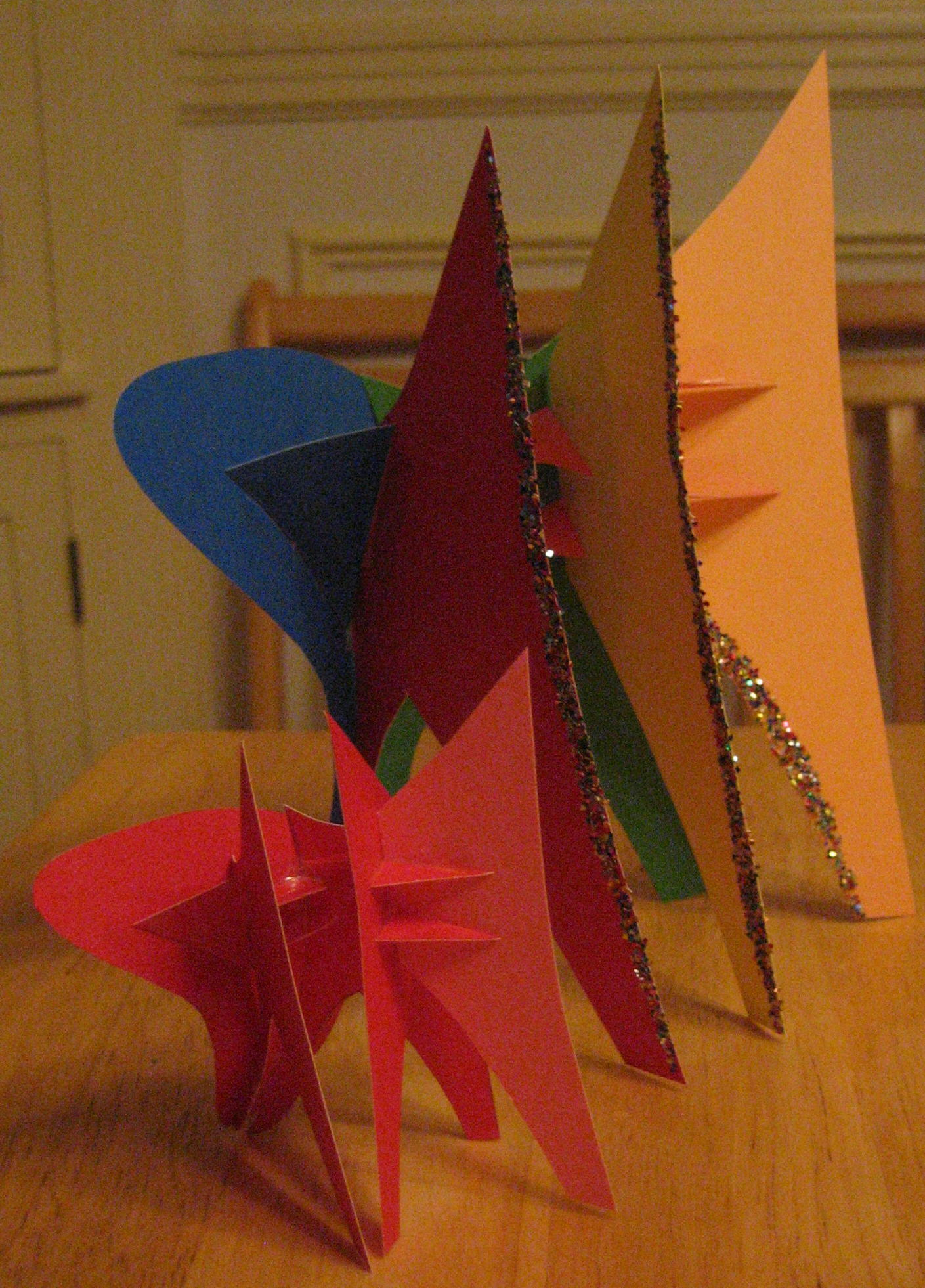 Five main planes on the original sculpture, five colors of cardstock, and five different multicolored models. Since the original is black, these are probably an order of magnitude more cheerfully colored.