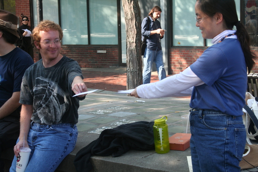 Here you can see one of the large Davis Square signs above where I installed my stained-glass version. Possibly, some of the folks who stopped to read the sign but didn't enter were wary of leaving their contact info. Yet, a few people took the risk that I might be a nutcase who wanted to send them spam email.