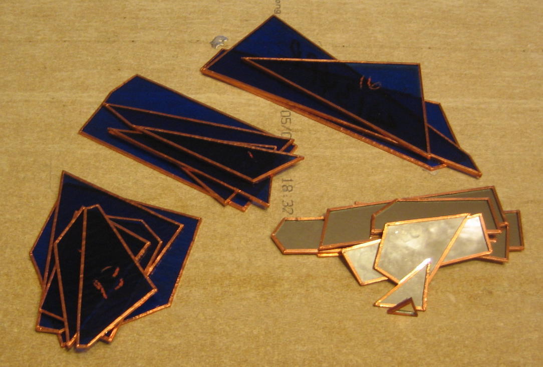 Then, I applied copper foil tape to the edges of the glass. This is critical, because lead solder does not stick to plain glass by itself.